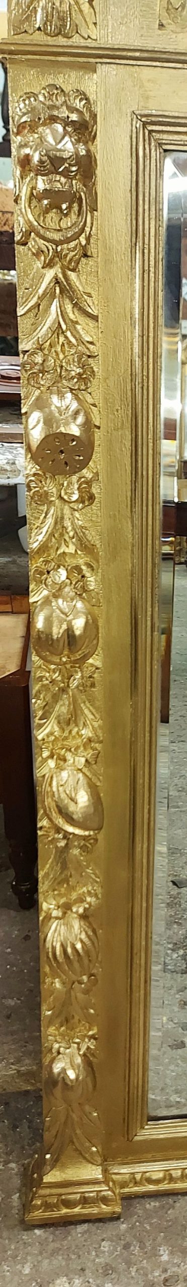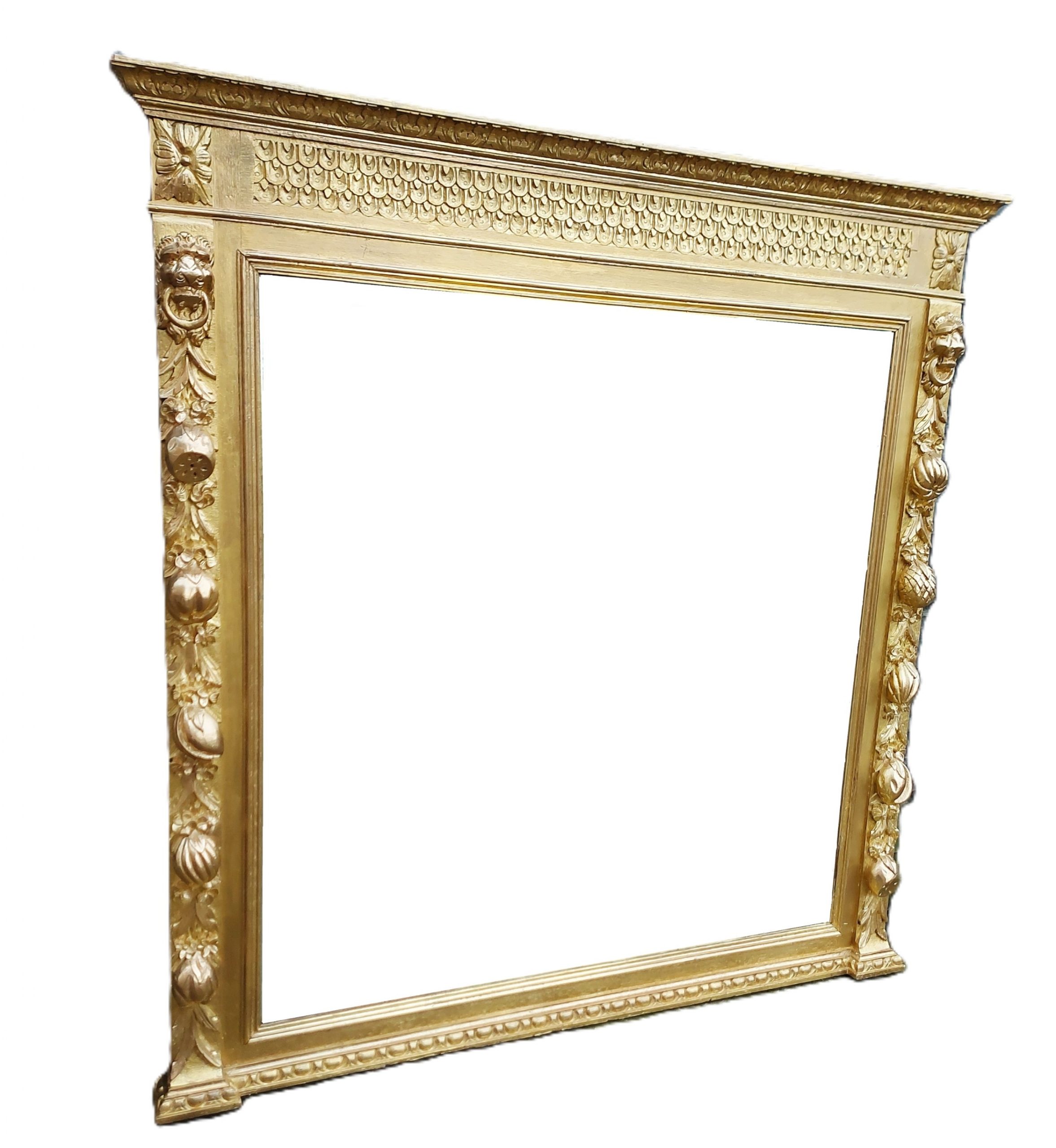 A 19th Century Gilt Overmantle Mirror with carved fruits and masks. The mirror retains its original bevelled glass and also has its original backboards.
