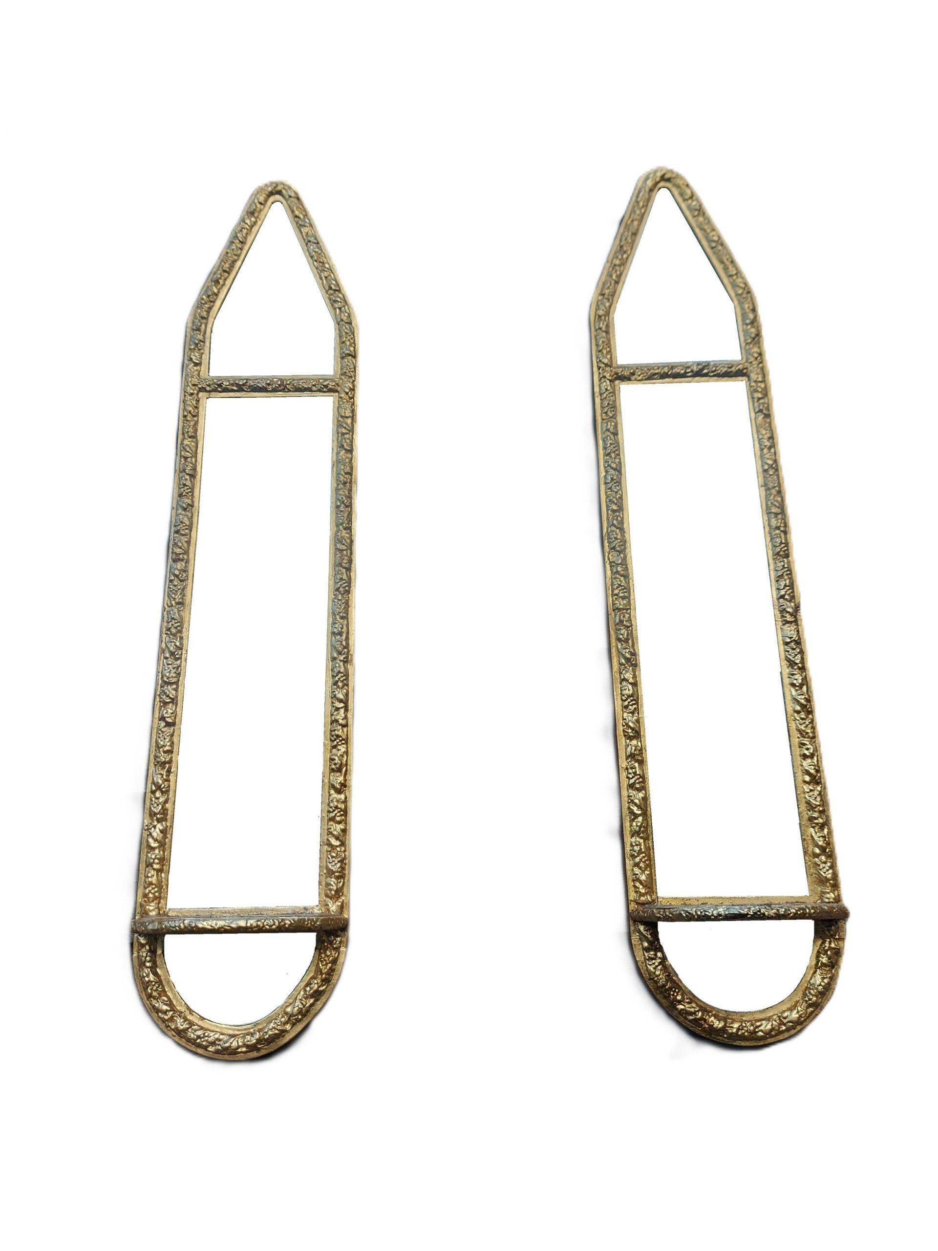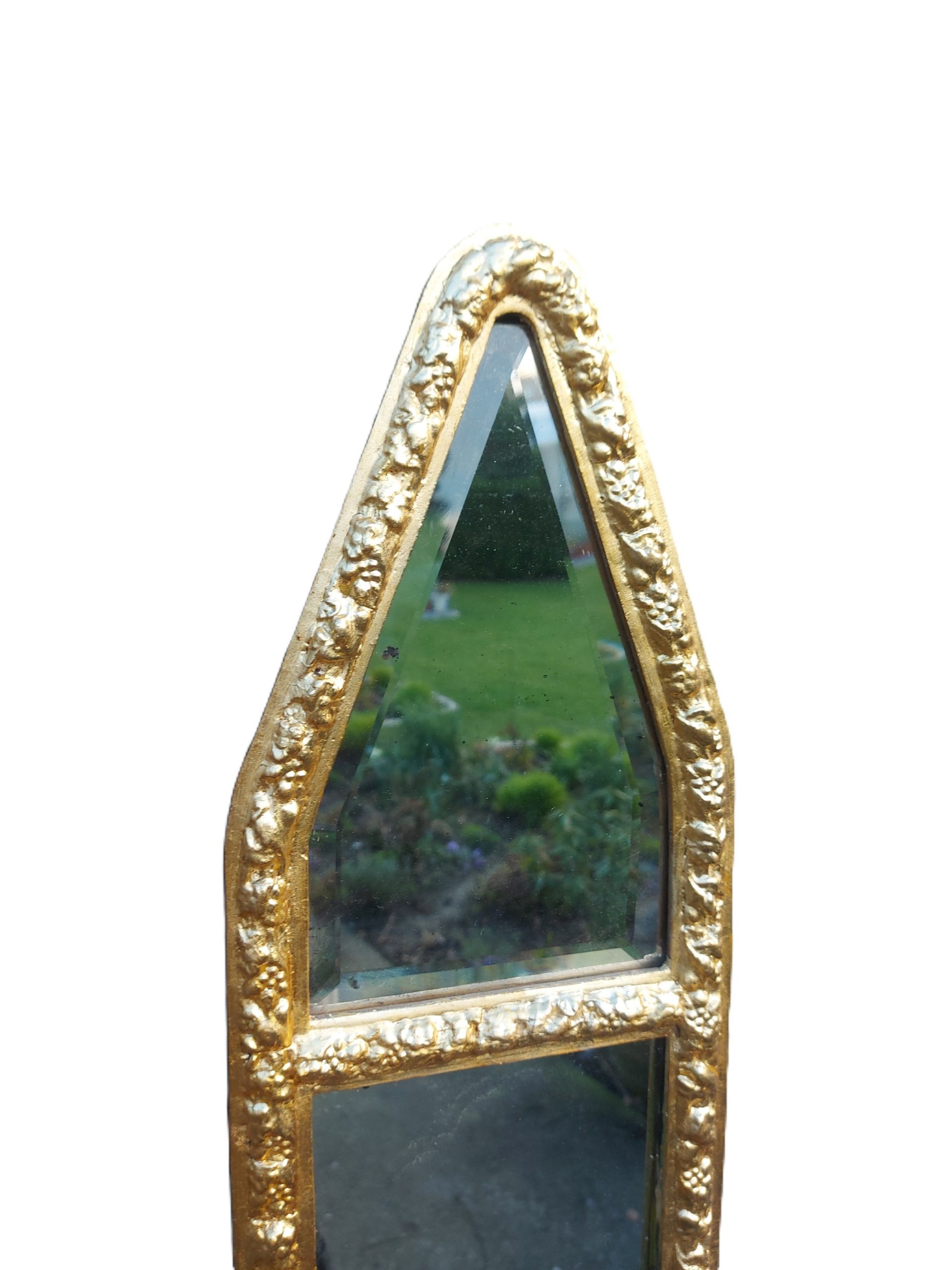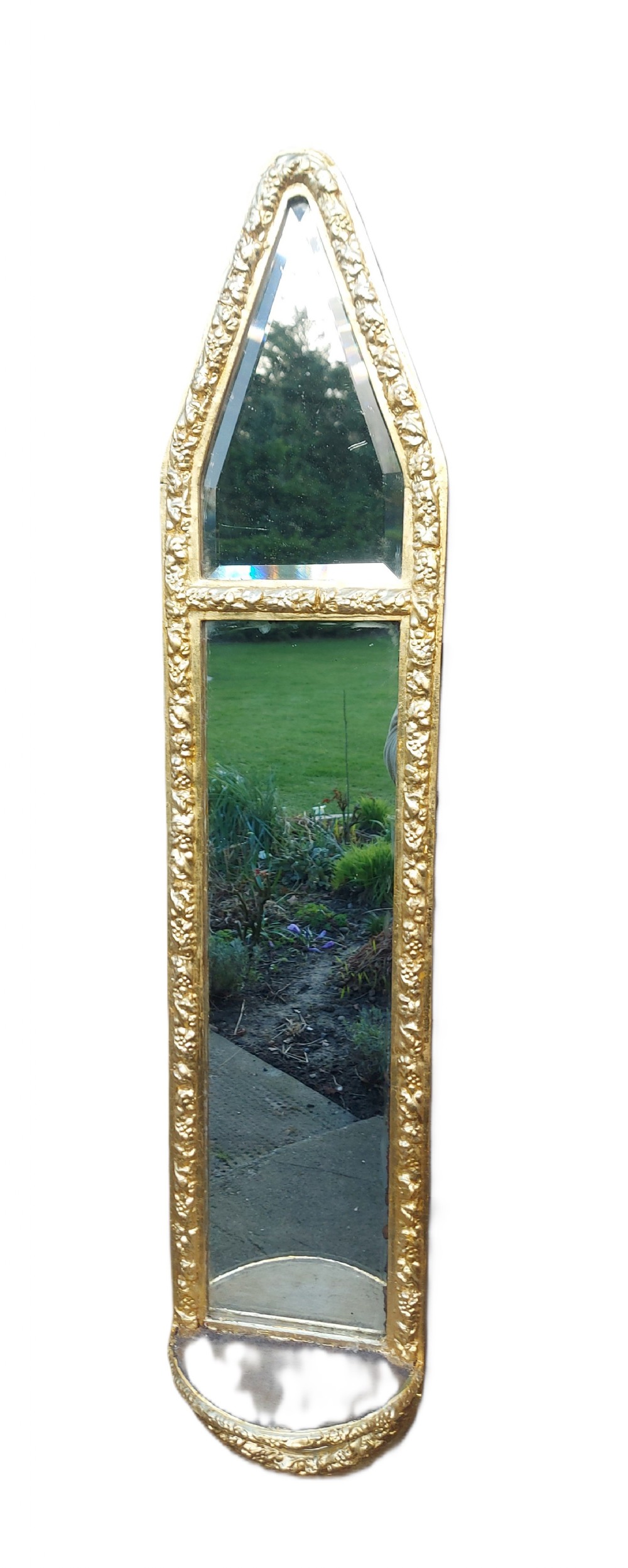 A pair of unusual Gothic style long and slender gilt wall mirrors with original bevelled glass and backs.