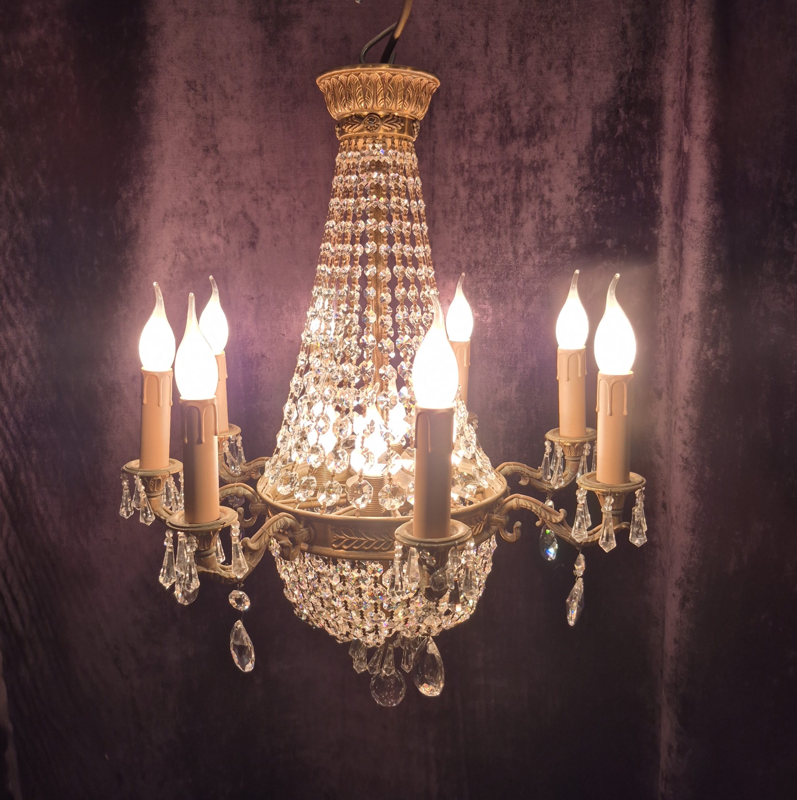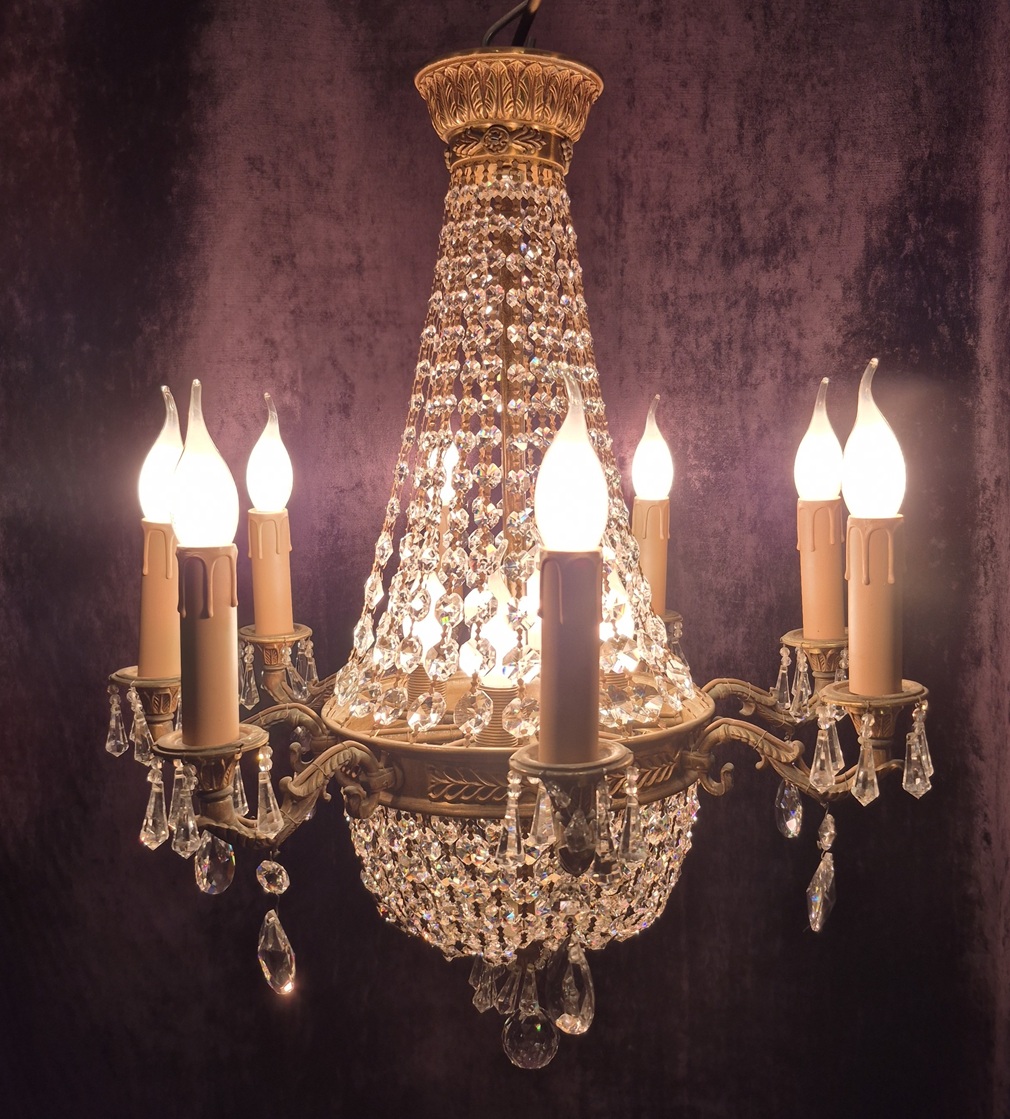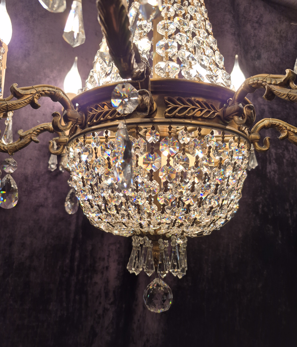 A wonderful French Montgolfiere cyrstal chandelier with eight exterior lights and four internal lights.