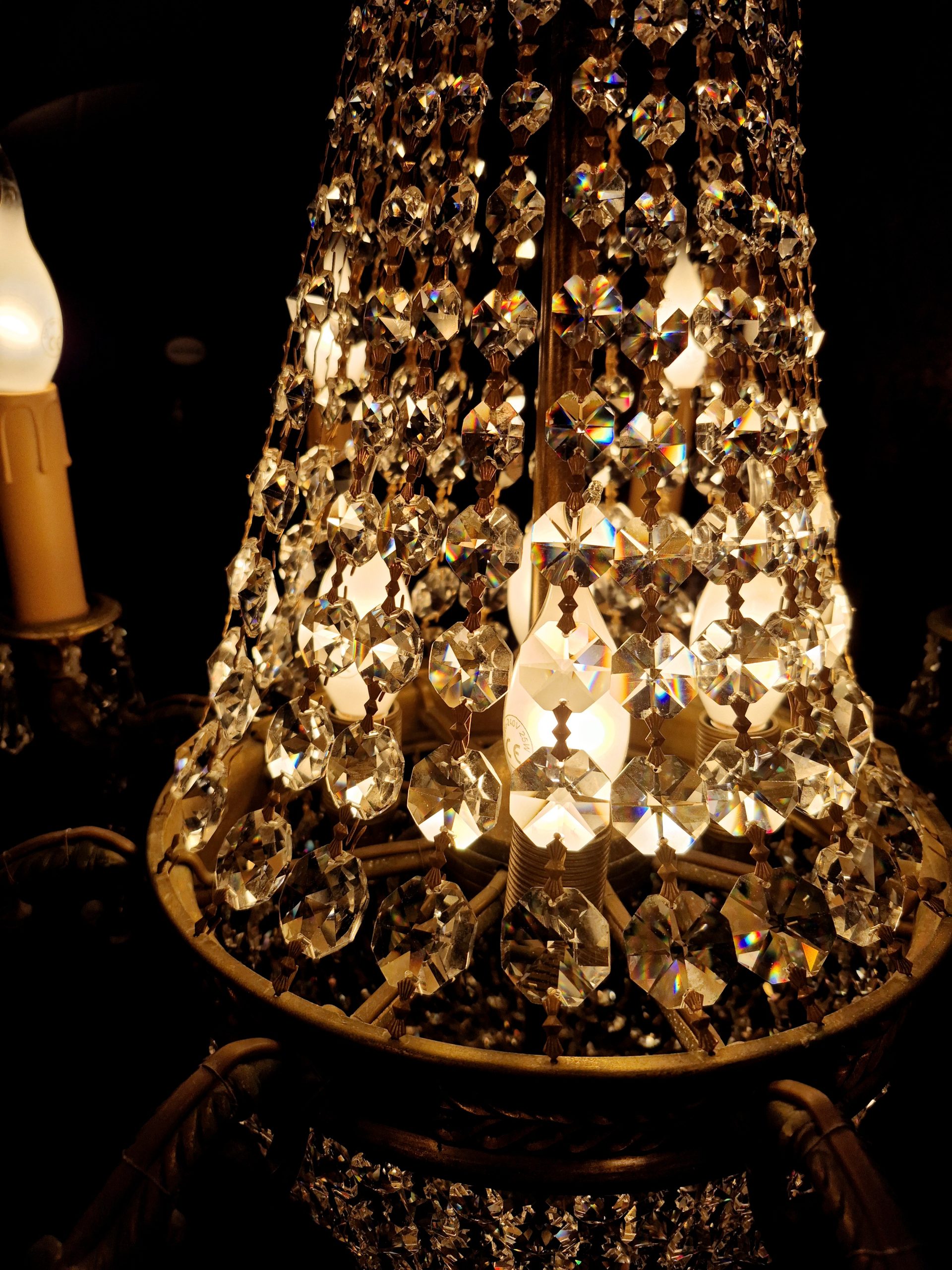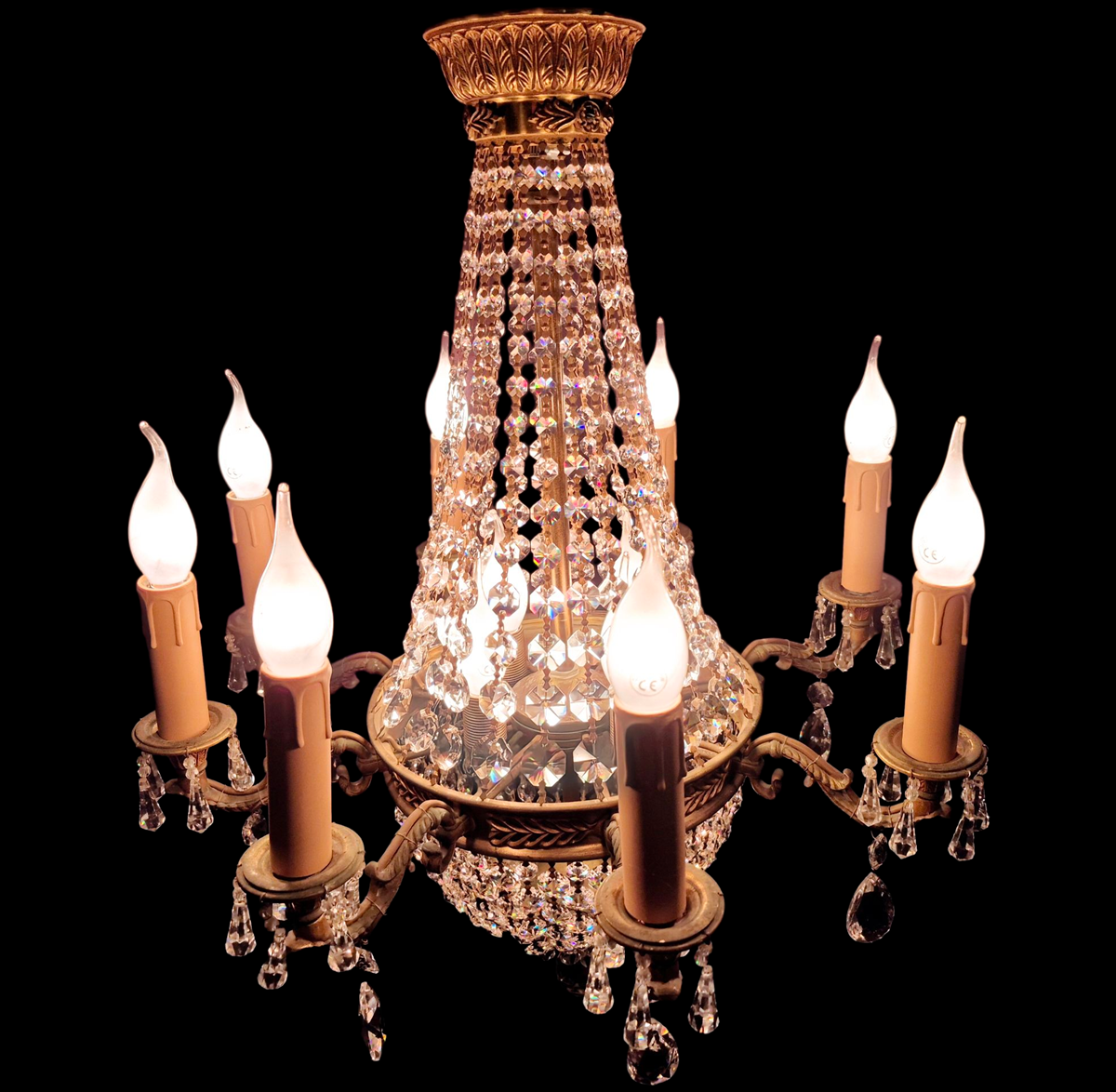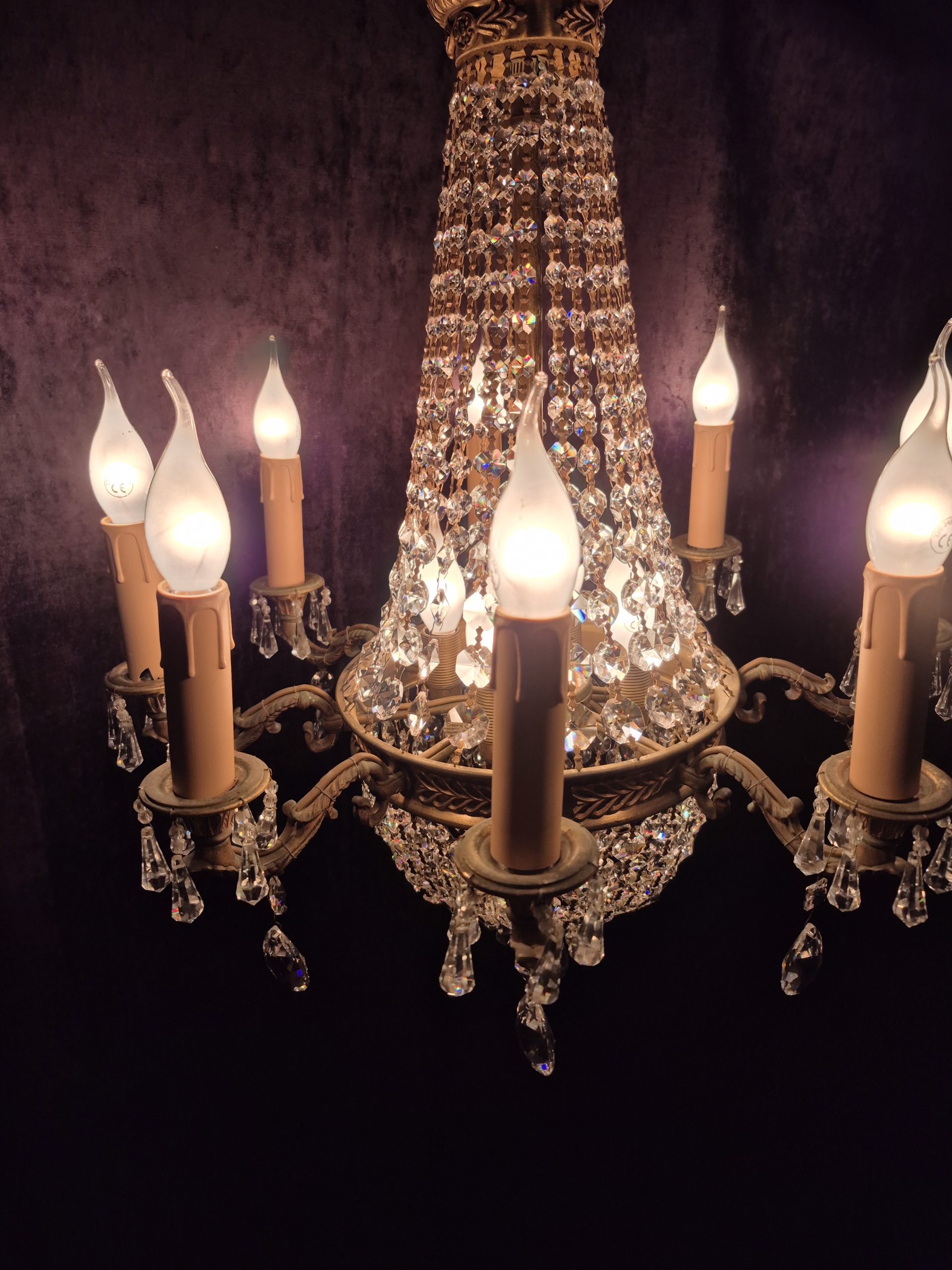 A wonderful French Montgolfiere cyrstal chandelier with eight exterior lights and four internal lights.