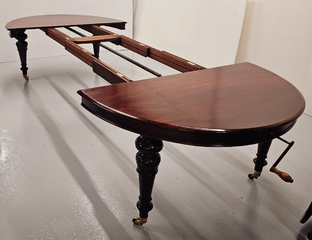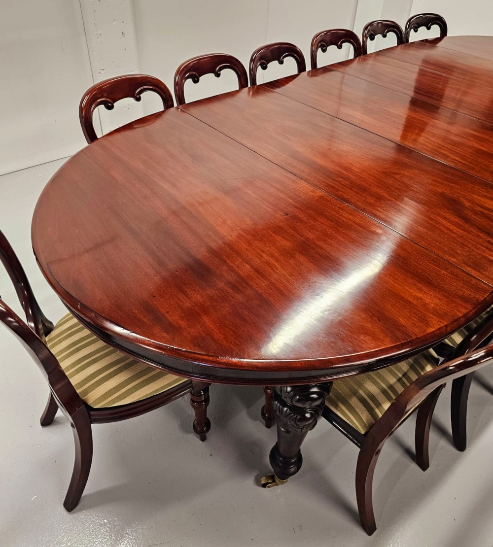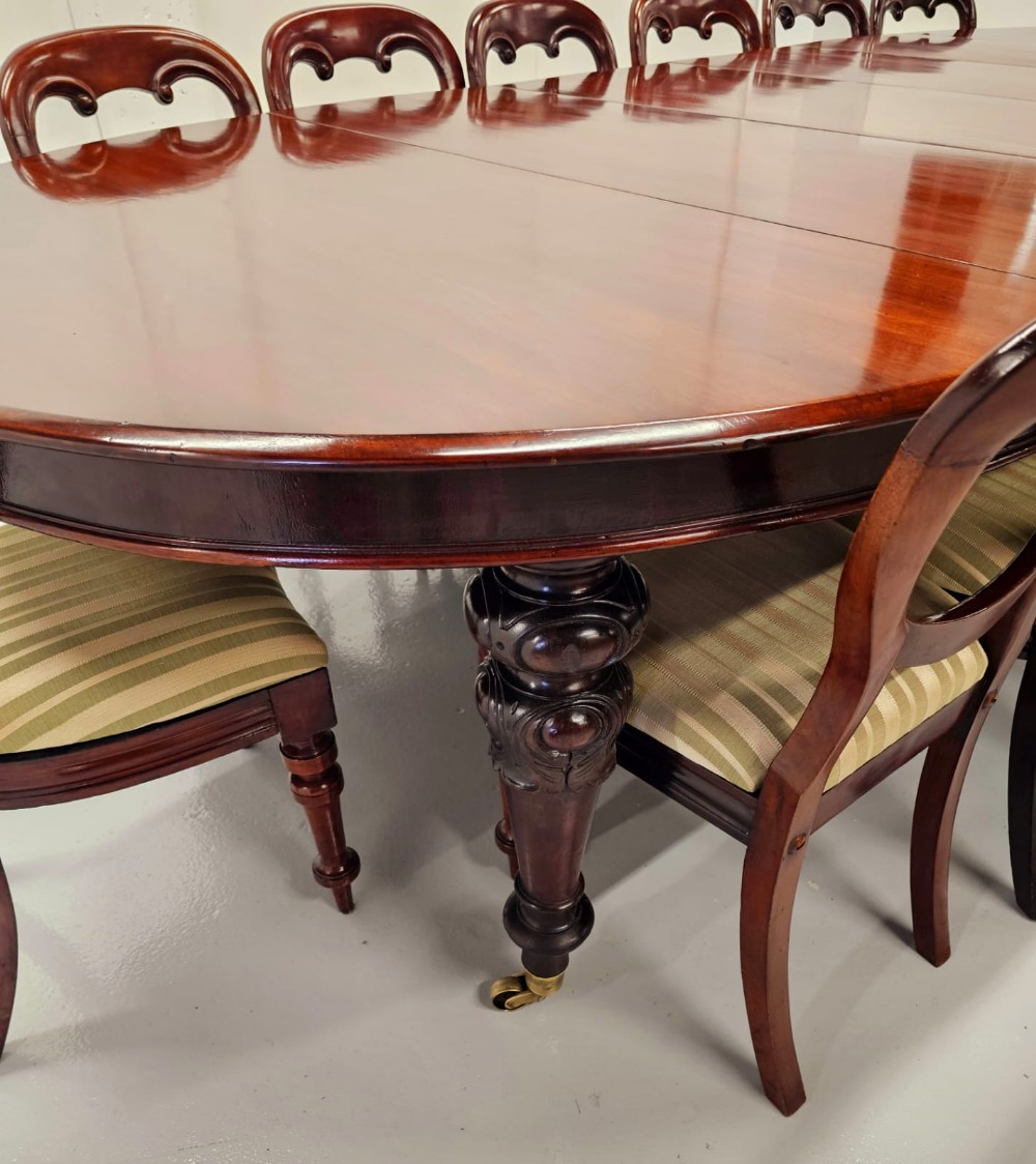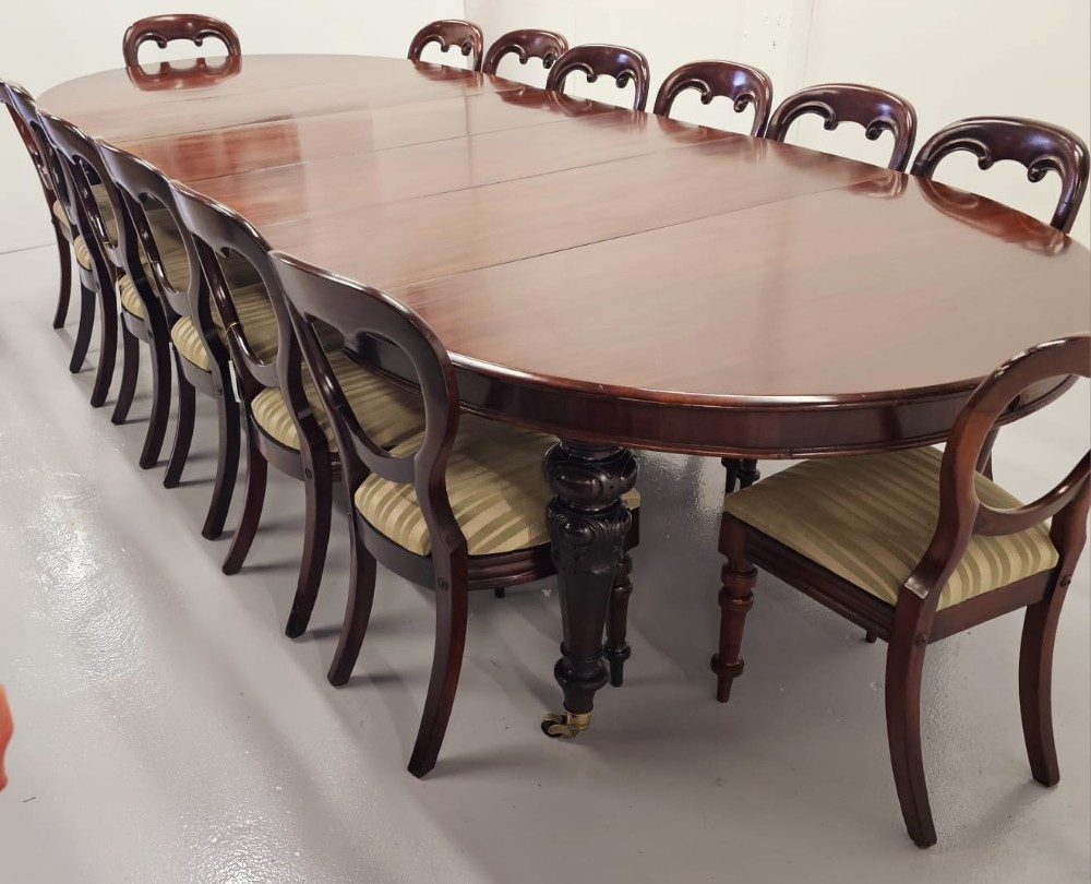 The table is shown with a set of 12 mahogany dining chairs and two extra.