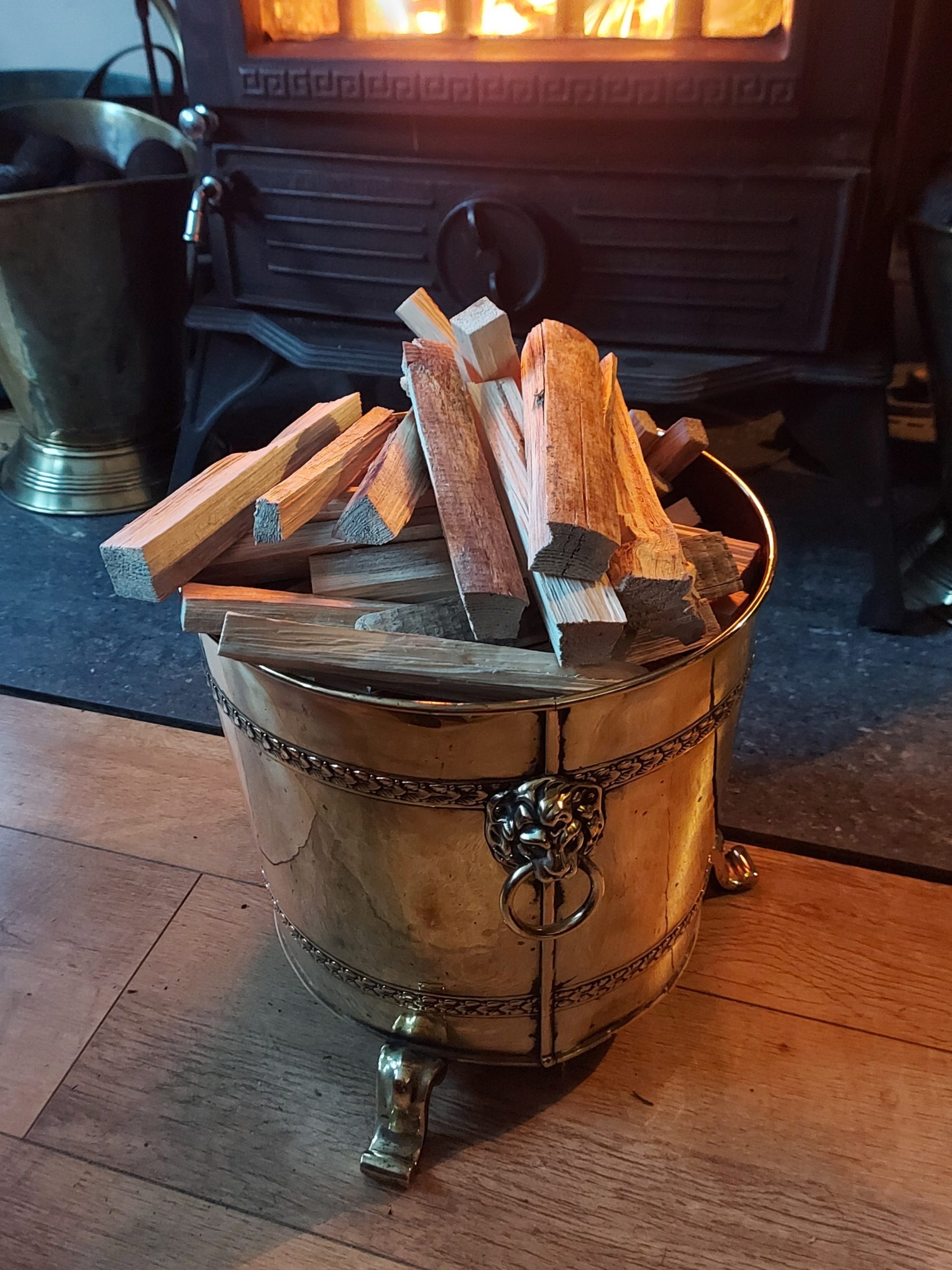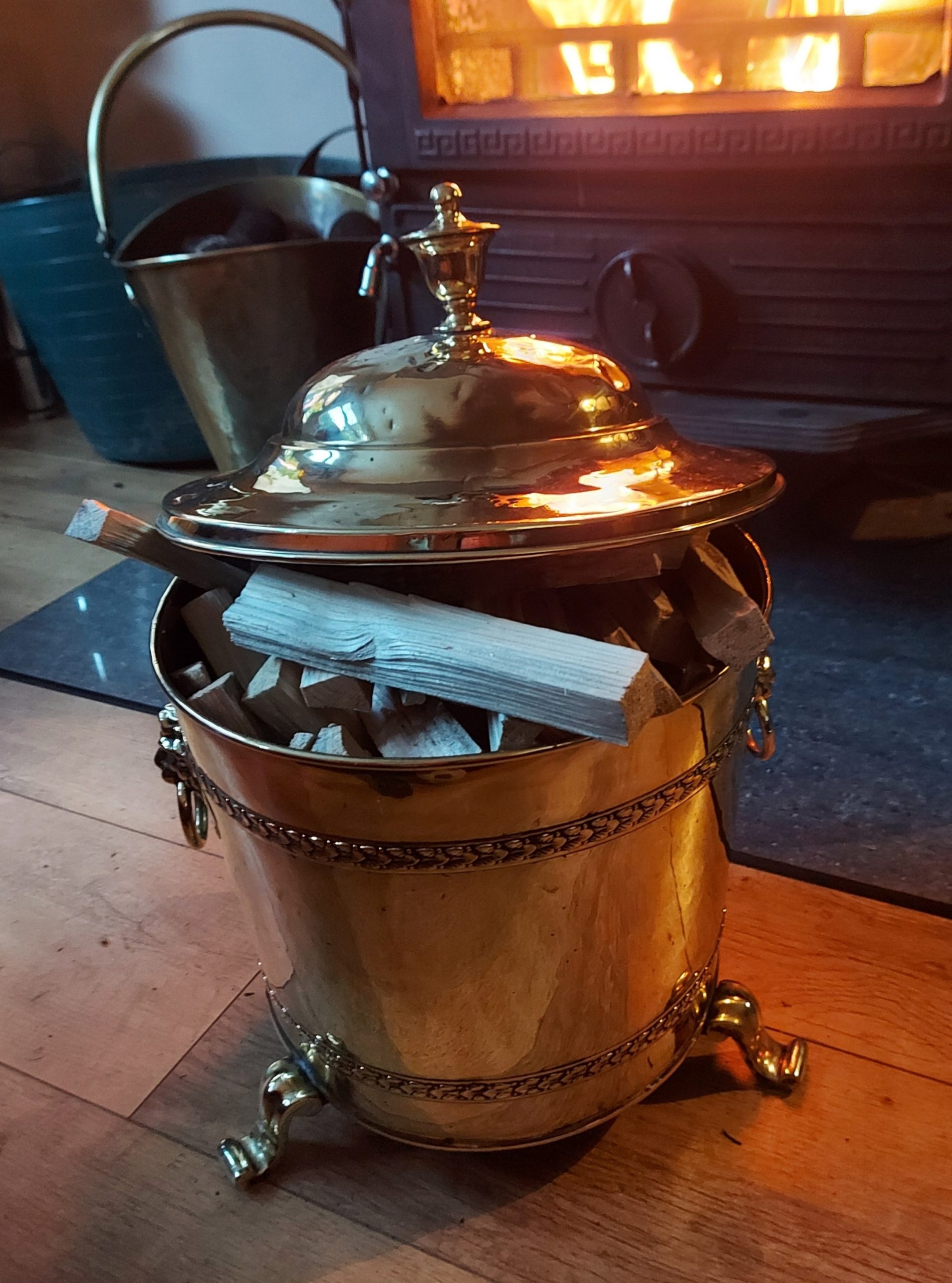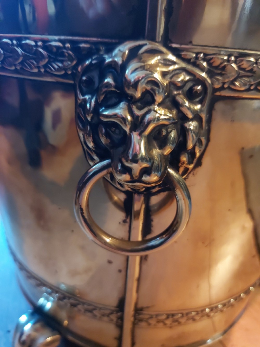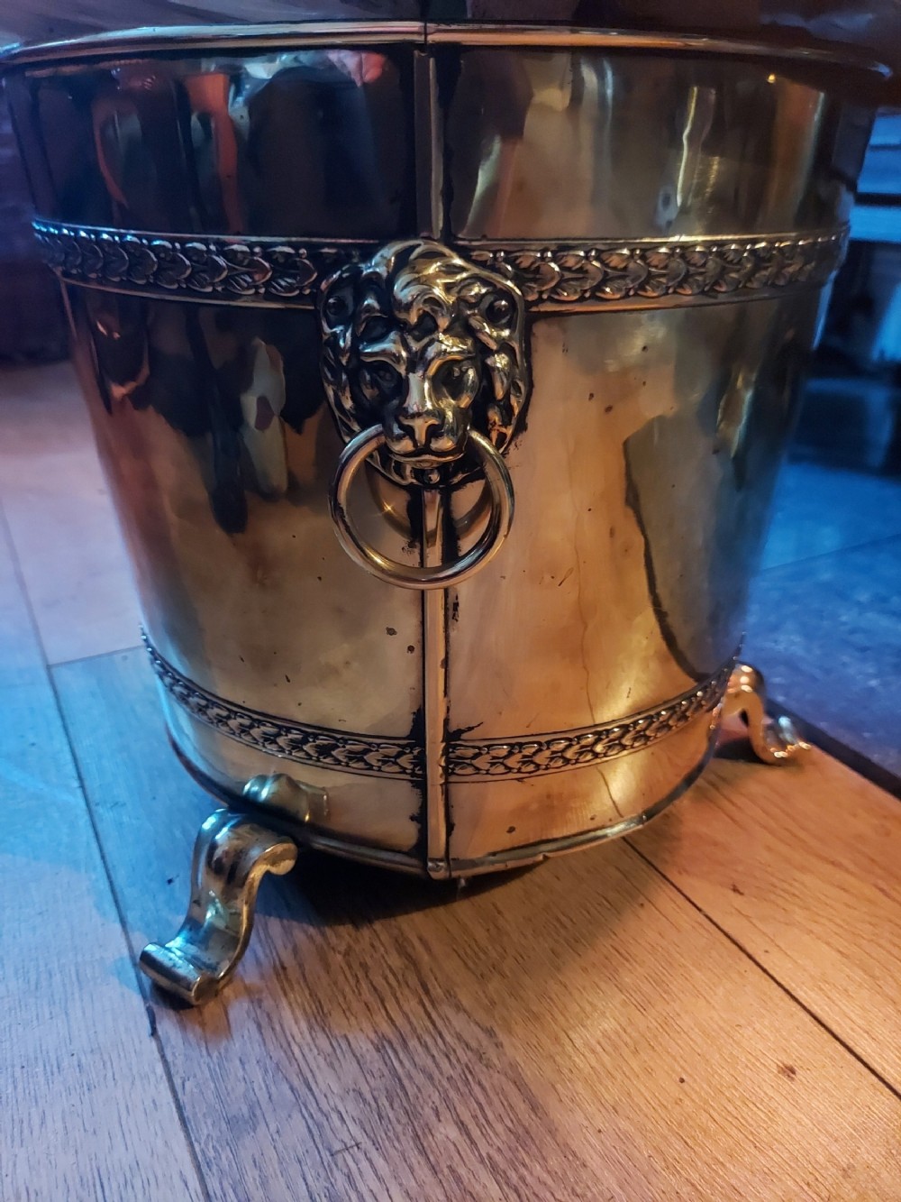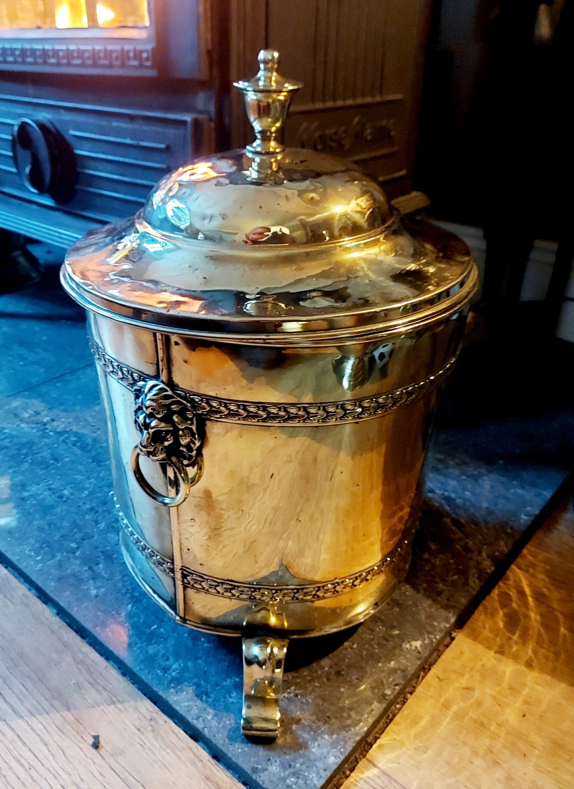 An Irish Edwardian Brass Coal / log Bucket with domed lid. The bucket / bin has two lion mask handles and stands on three brass feet.