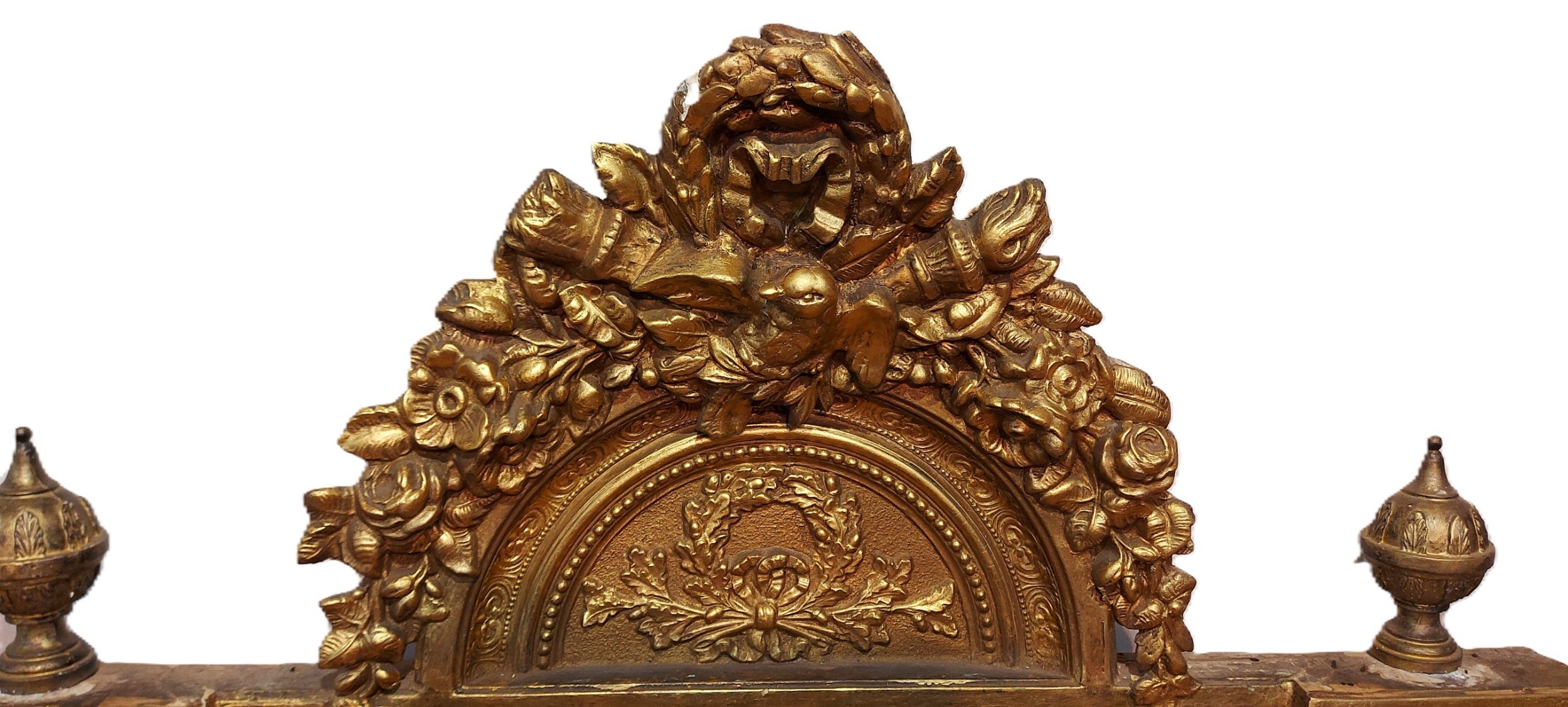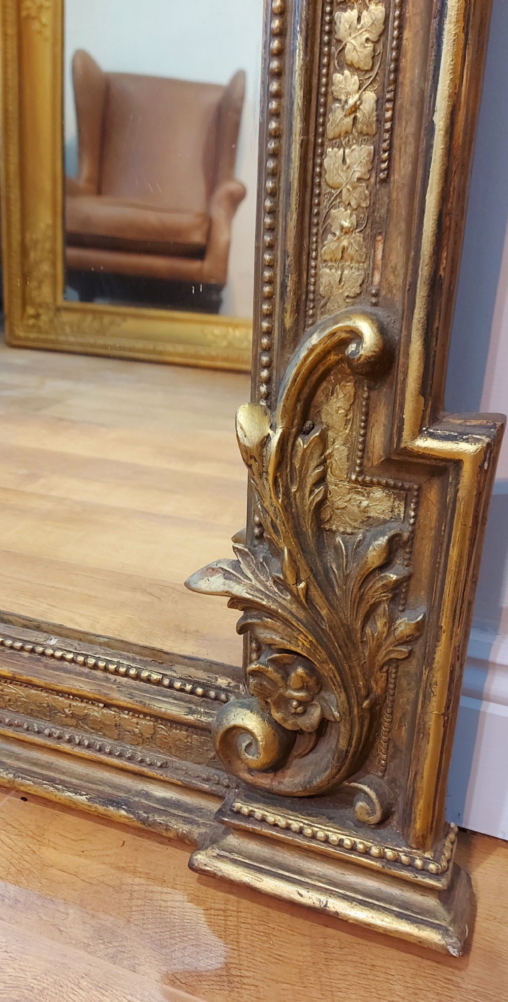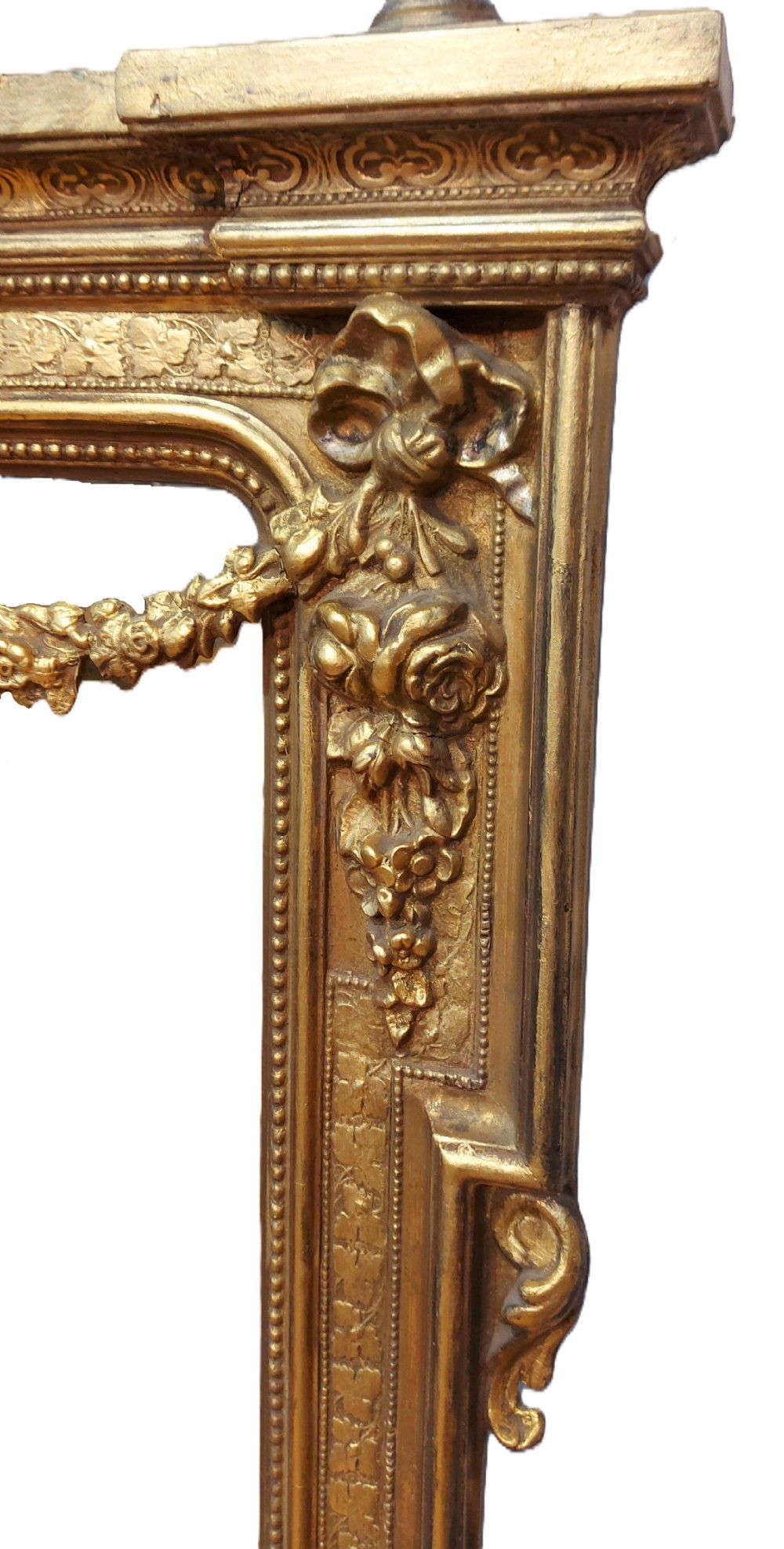 A large highly ornate 19th Century French Gilt Pier Mirror with floral carved crest and swag decoration. The mirror retains its original glass and original back.