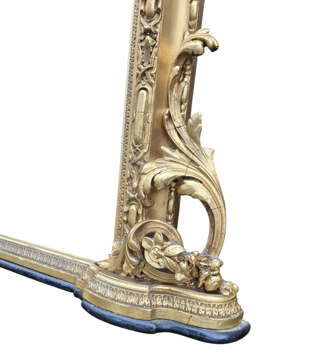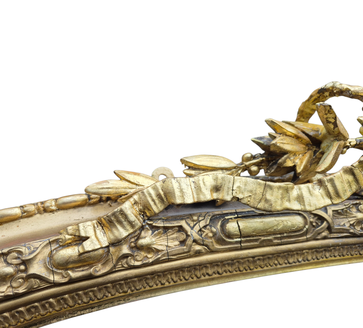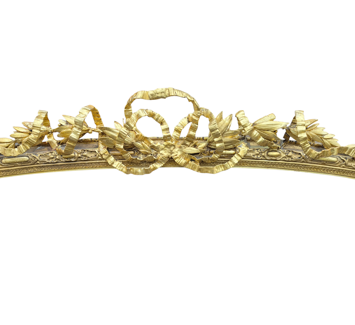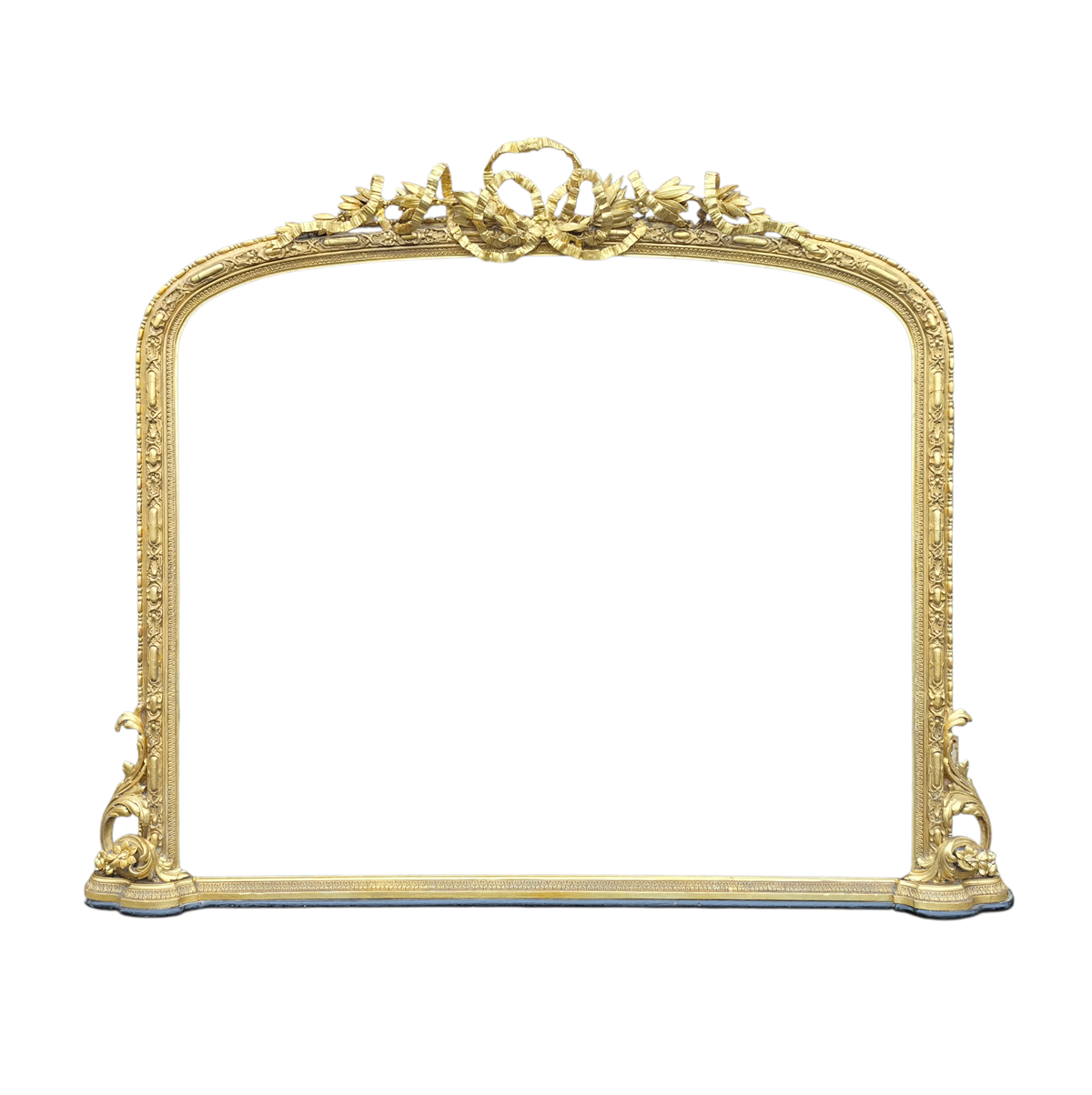 A beautiful large 19th Century Gilt Overmantle Mirror with ribbon crest detail which retains its original mirror plate and original backboards