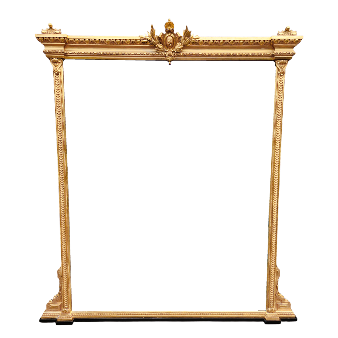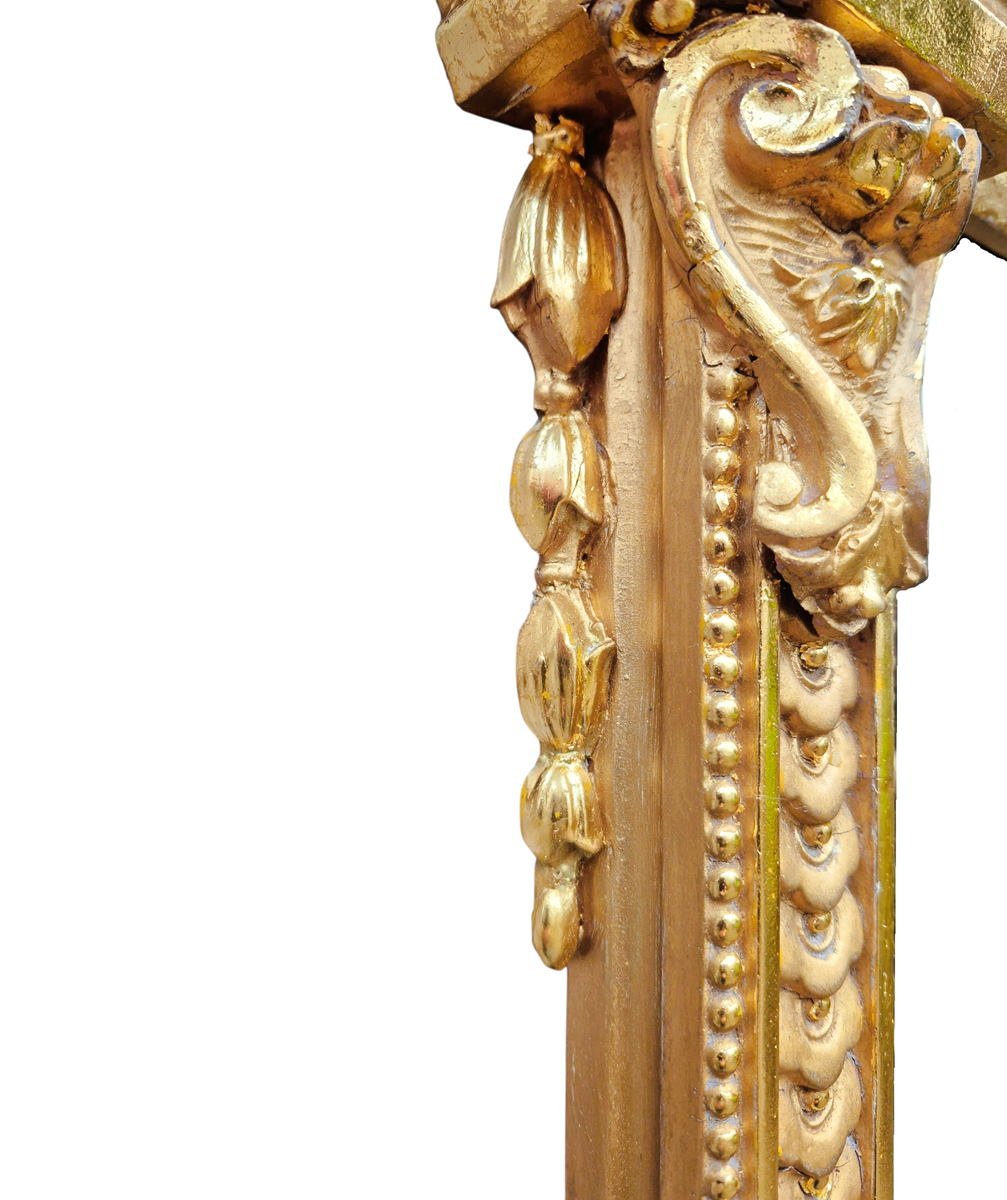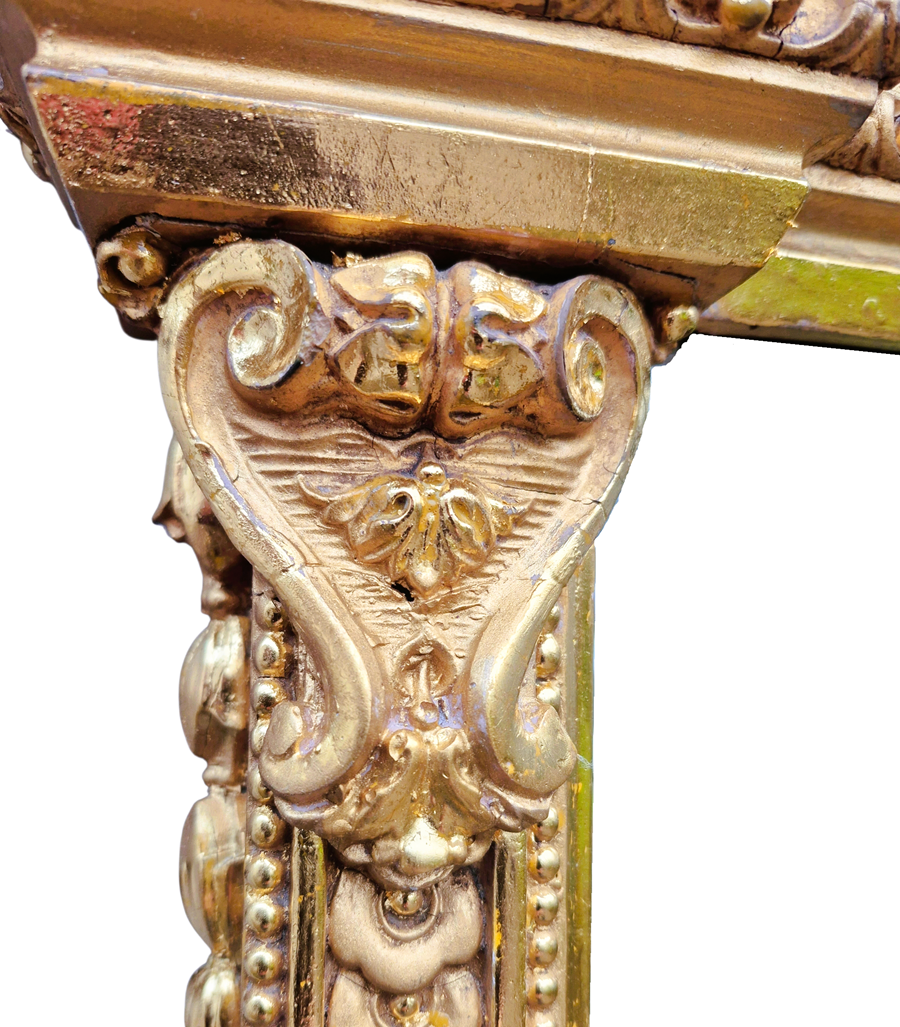 A fantastic large 19th Century rectangular gilt overmantle mirror which has just been restored and gilded with 23.75 carat gold. This is a very good quality mirror which retains its original 8mm mirror plate and original backboard. Most of the restoration was gilding with minor repairs to the frame.