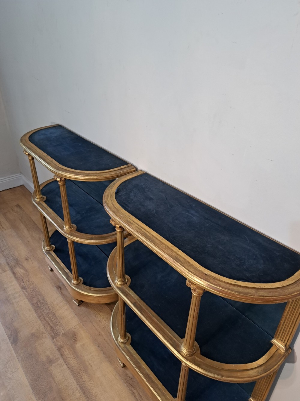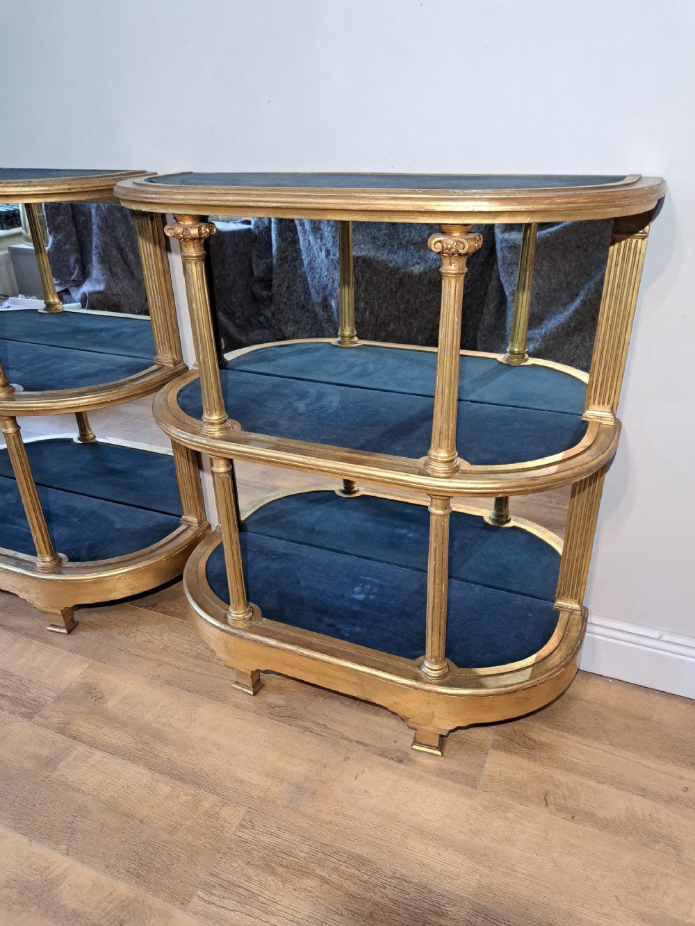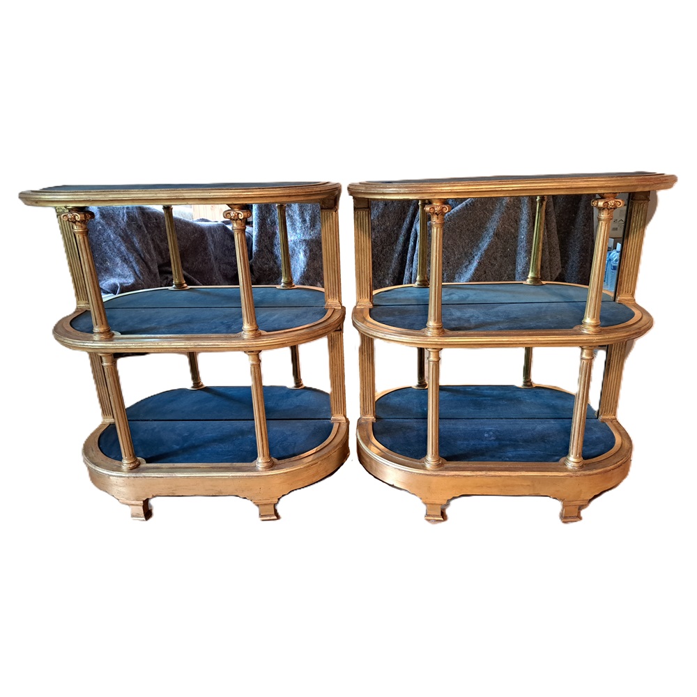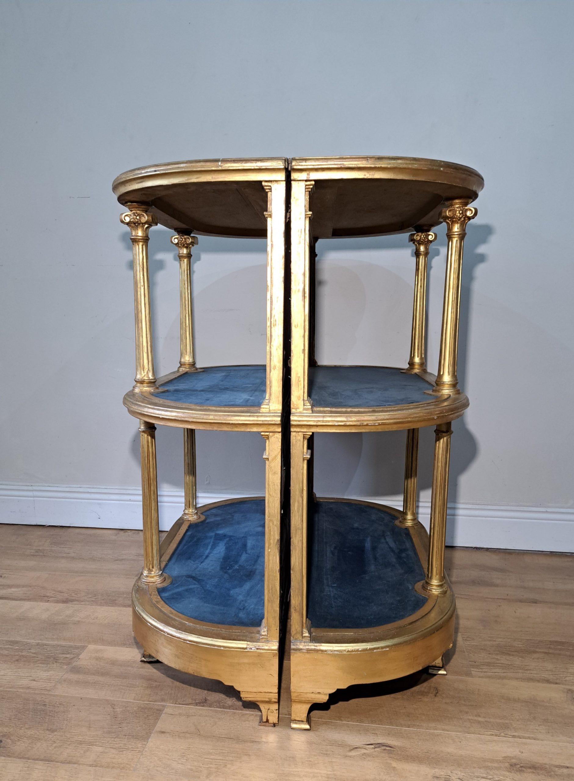 A pair of 19th Century mirrored display shelves with blue velvet. They could be used individually or put together to form a centre display.