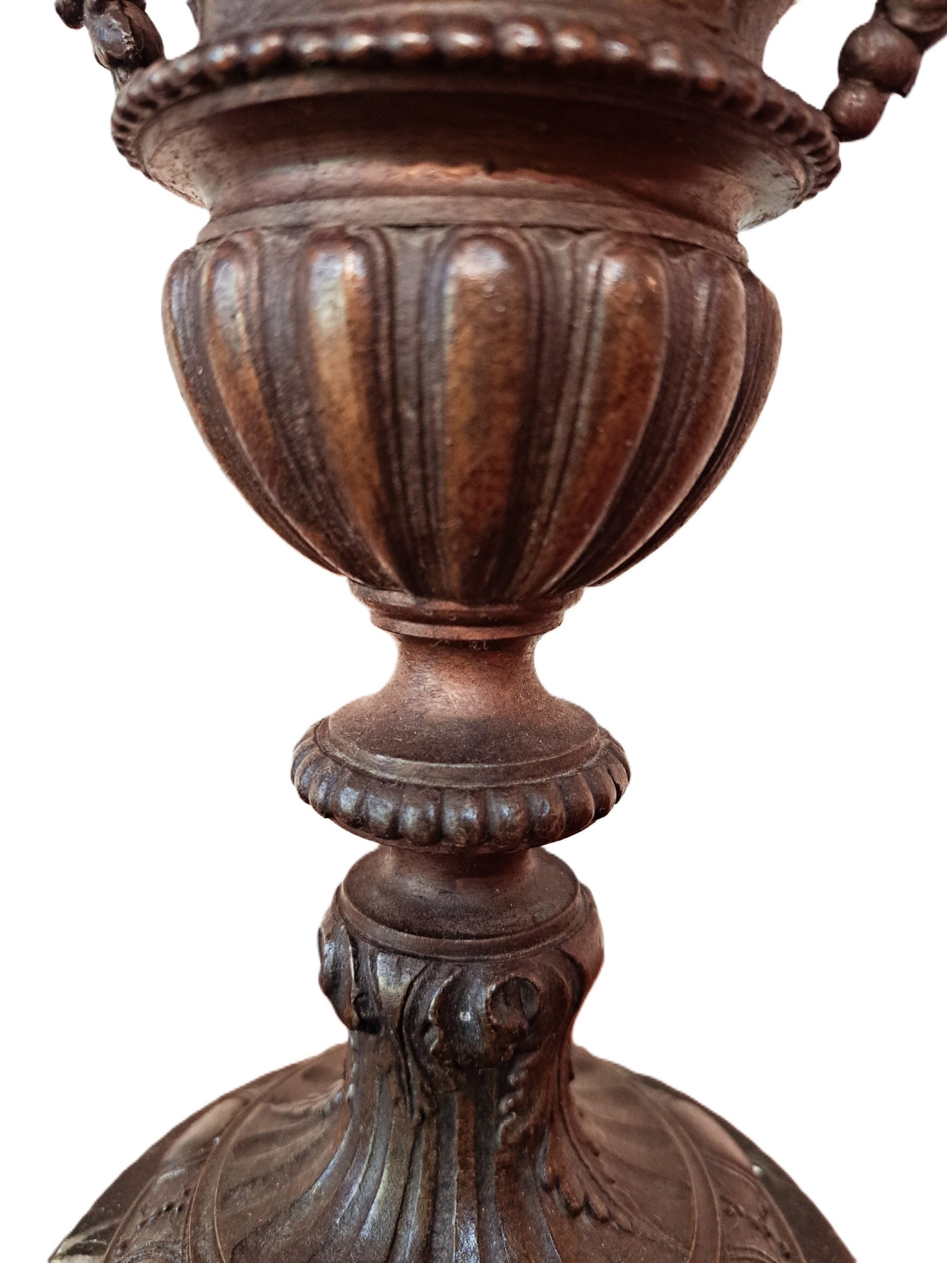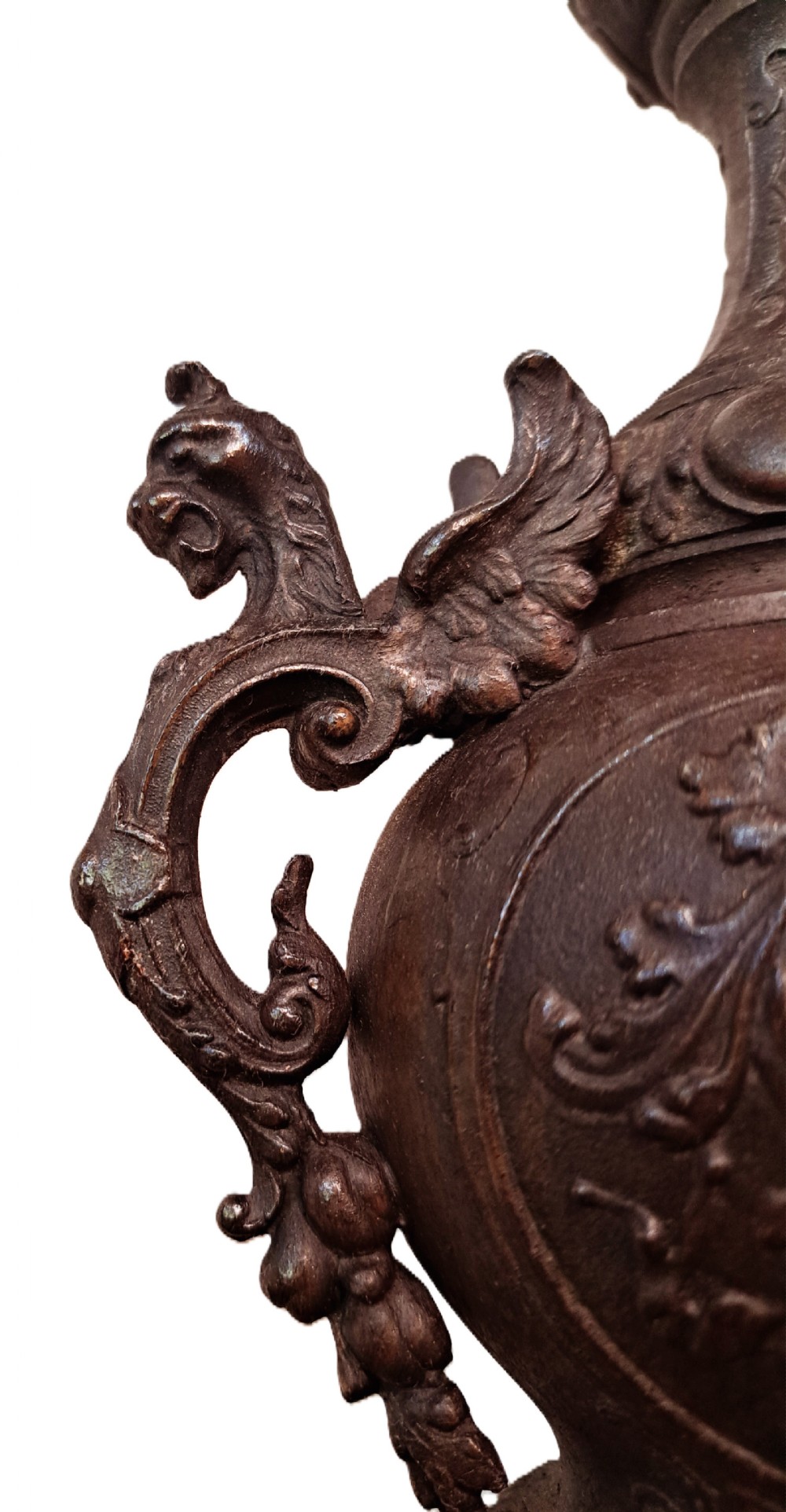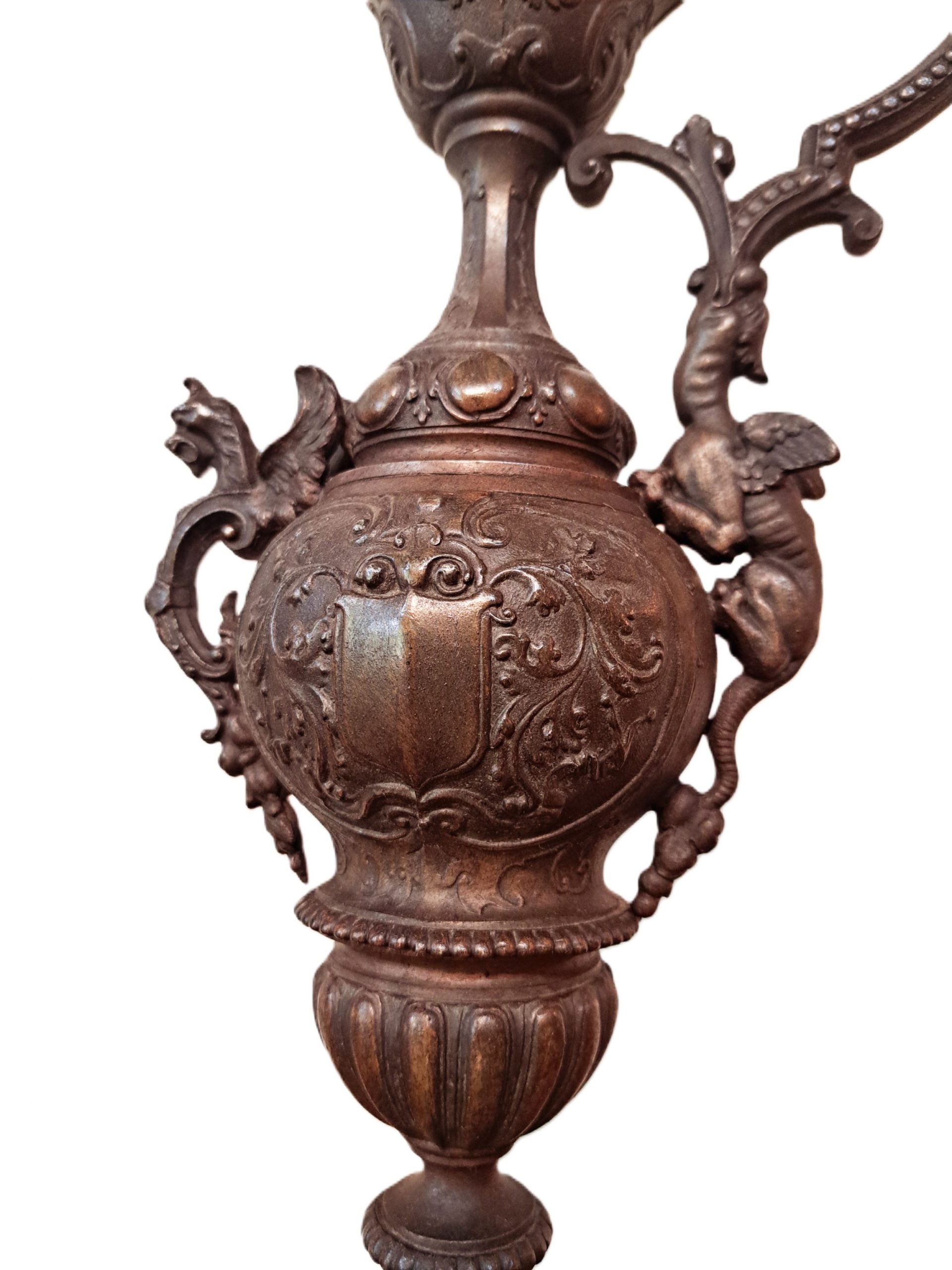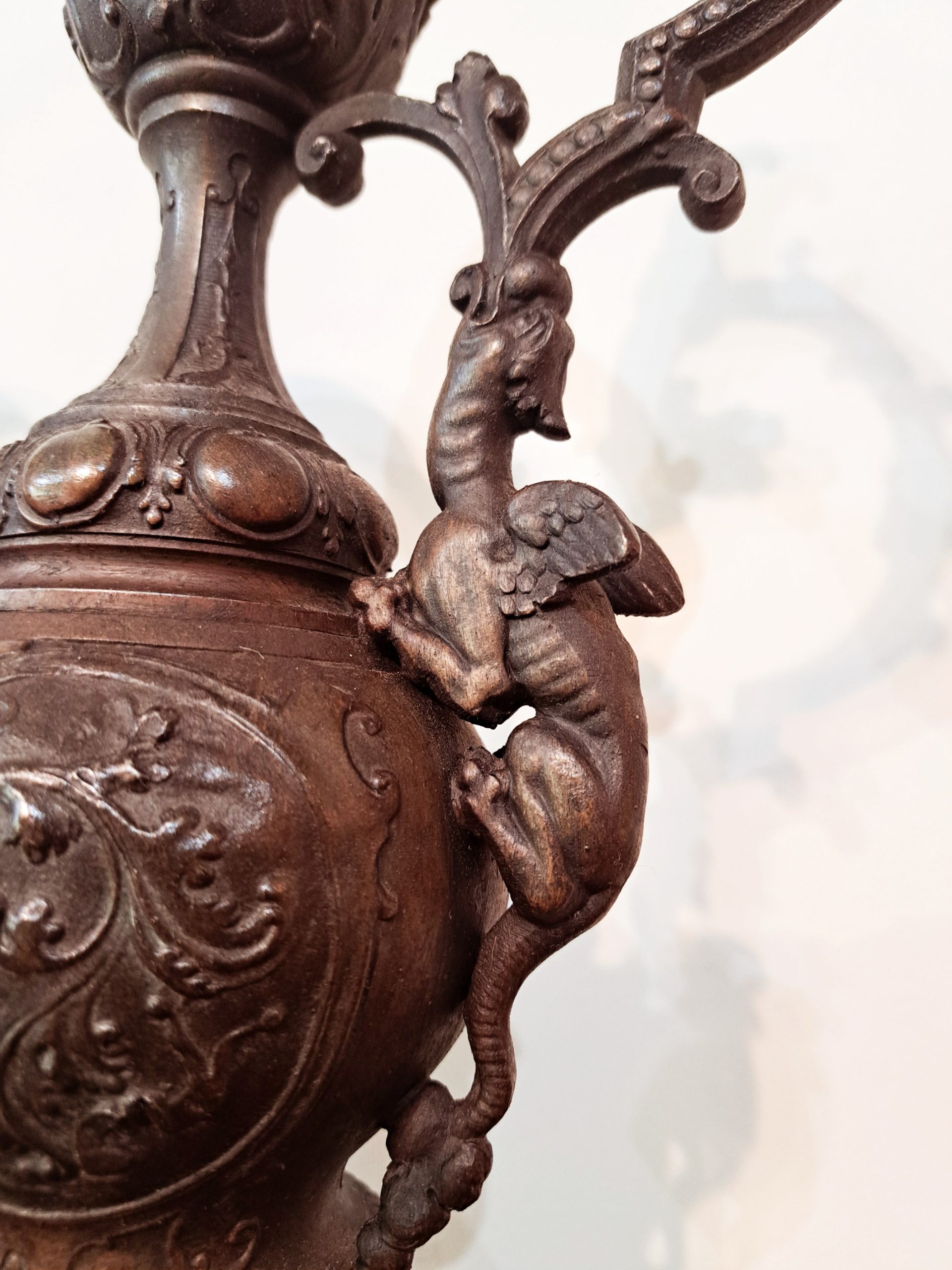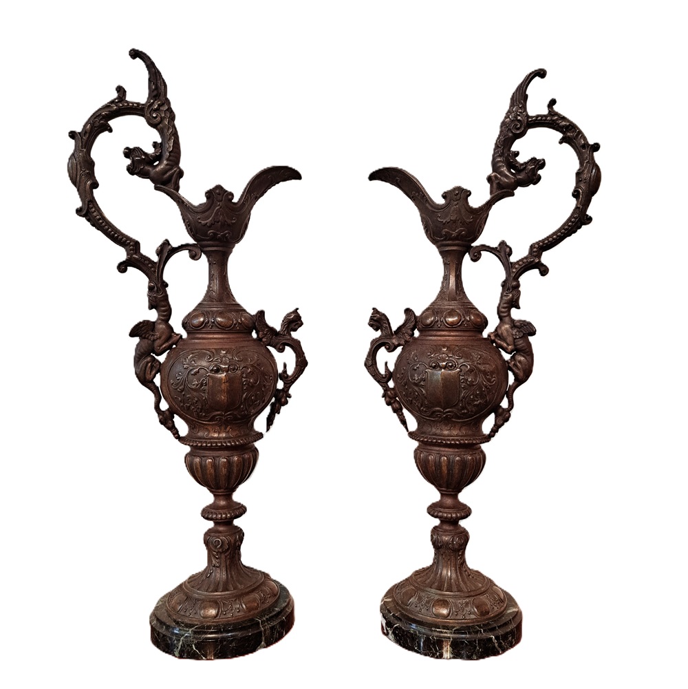 A pair of 19th Century French Spelter Ewers with bronze patina on black marble bases.