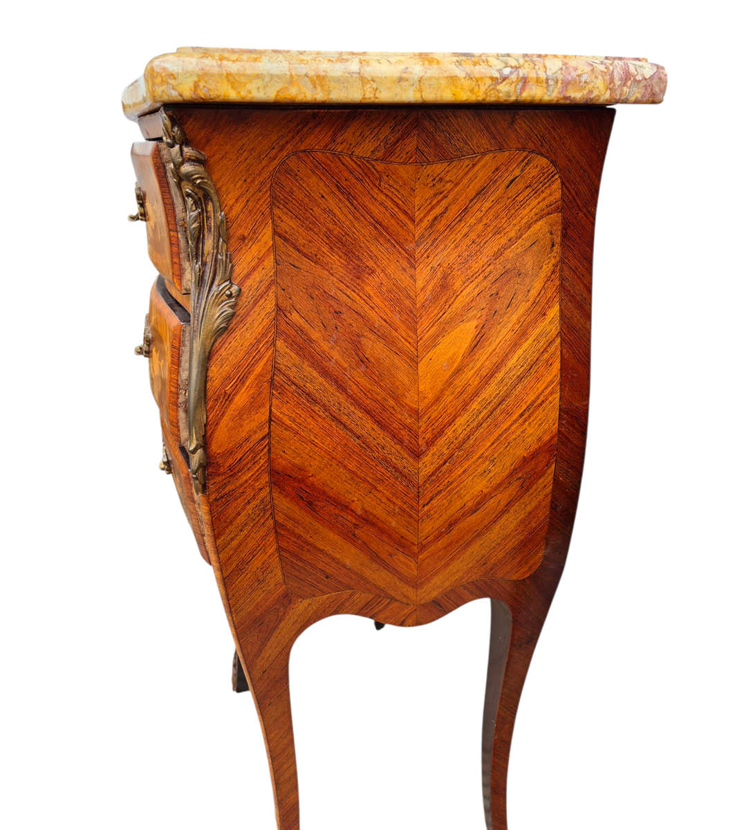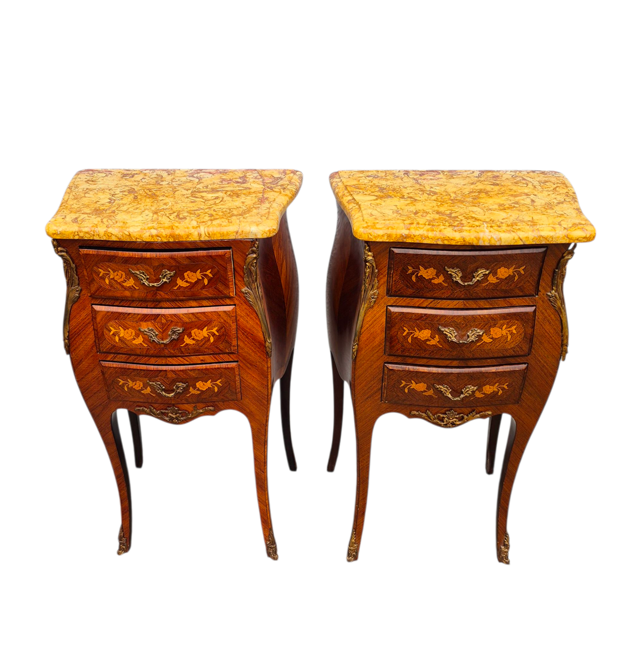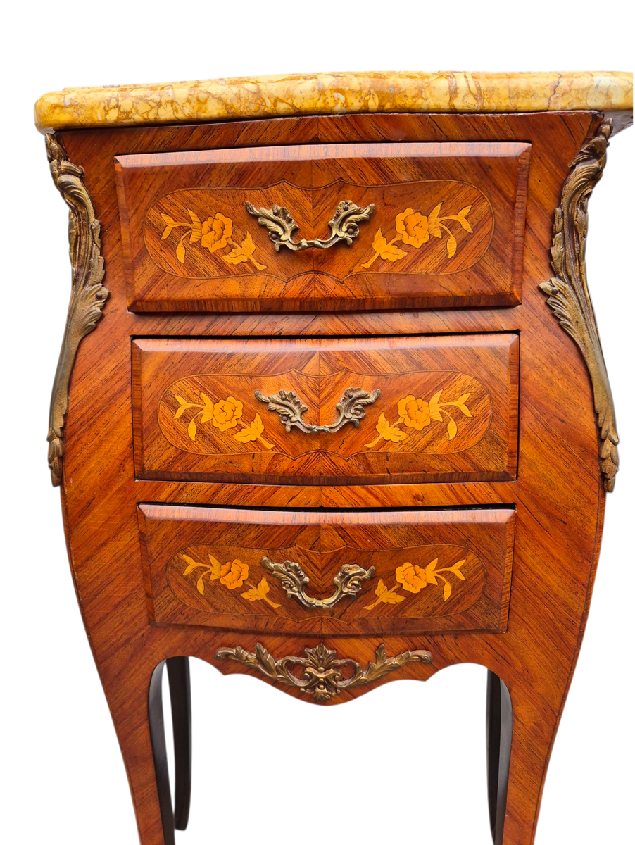 A quality pair of 3 drawer French marquetry bombe shaped bedside cabinets with ormolu mounts and marble tops in very good condition.