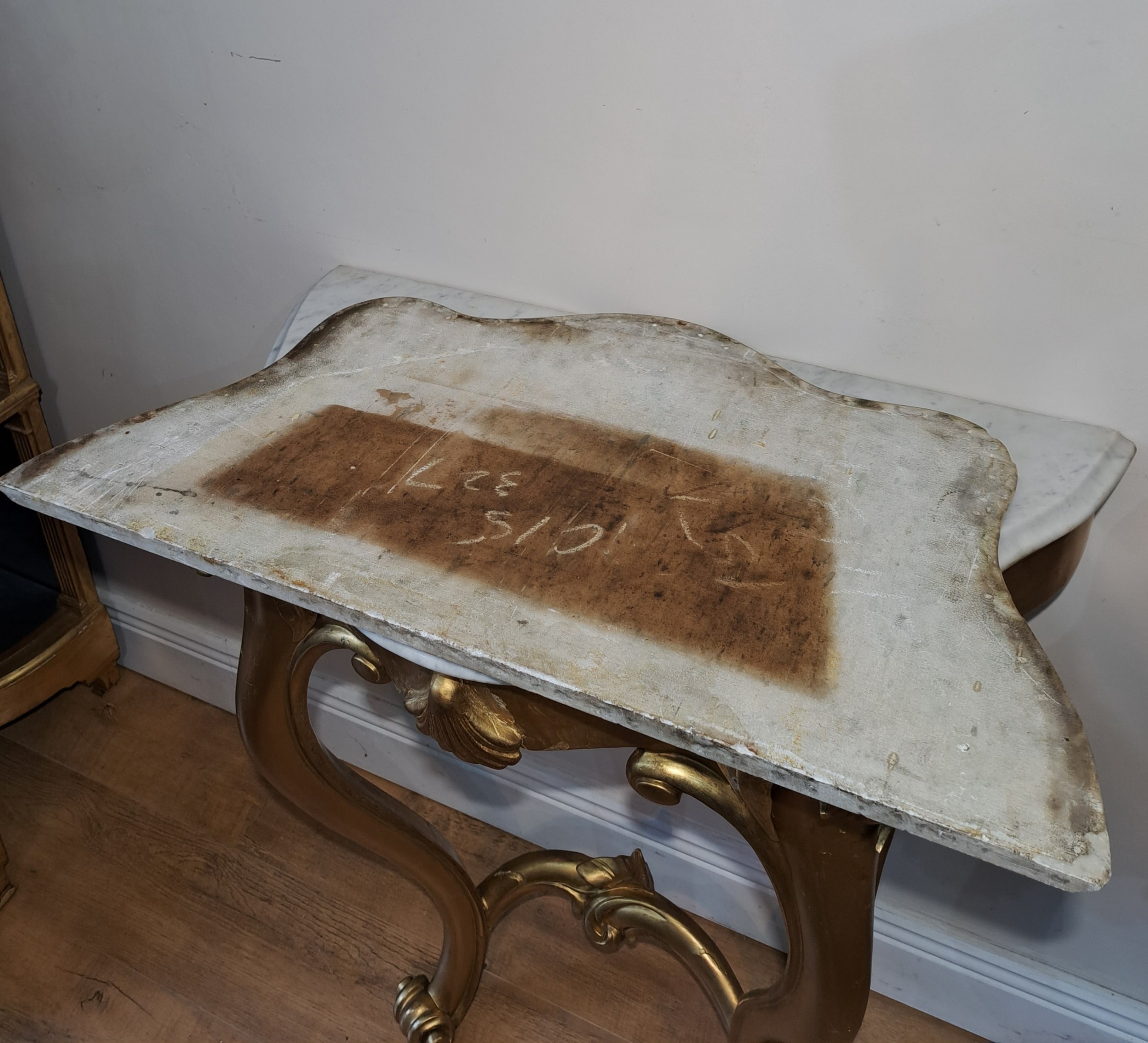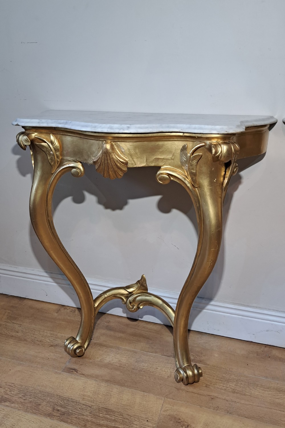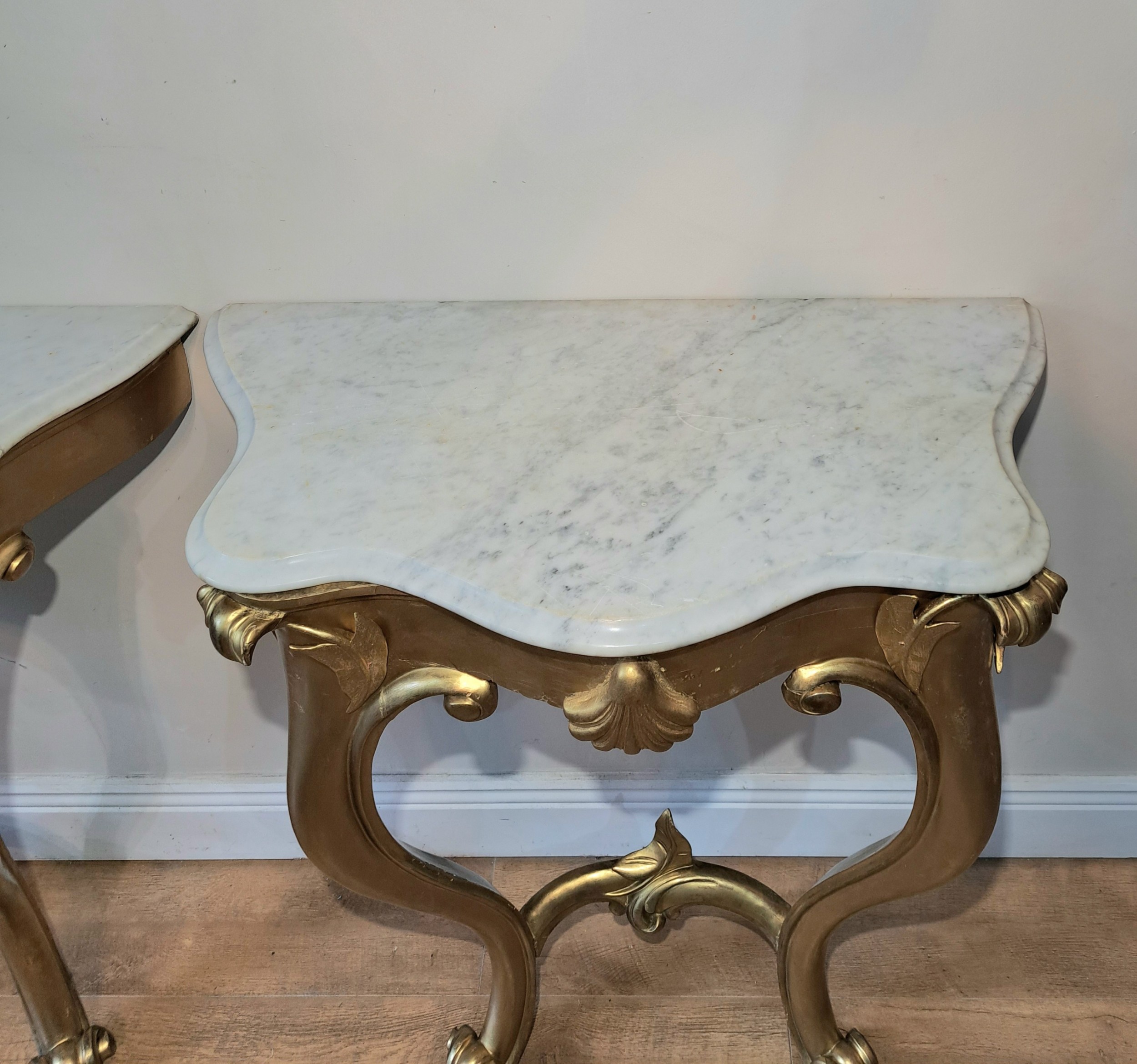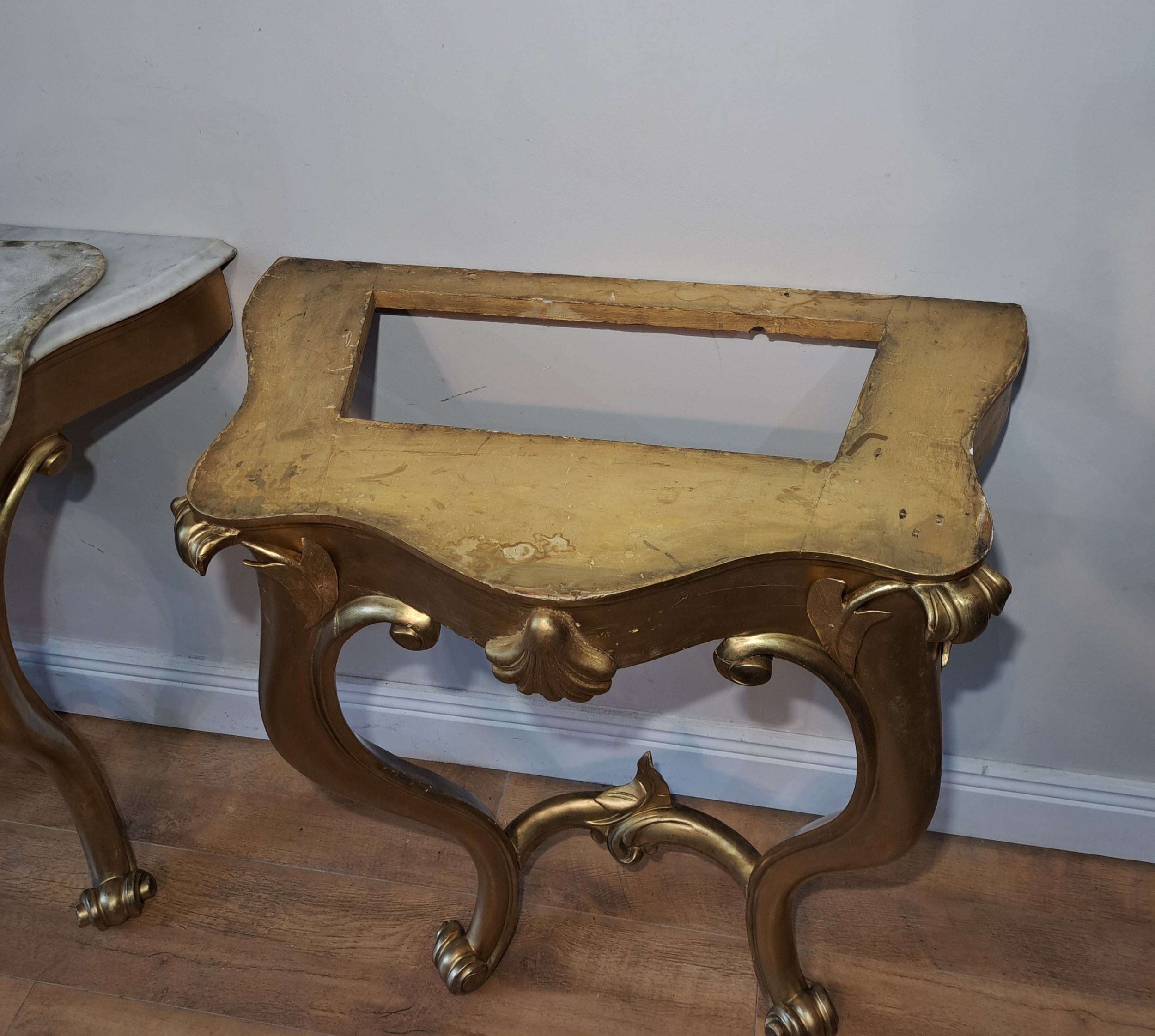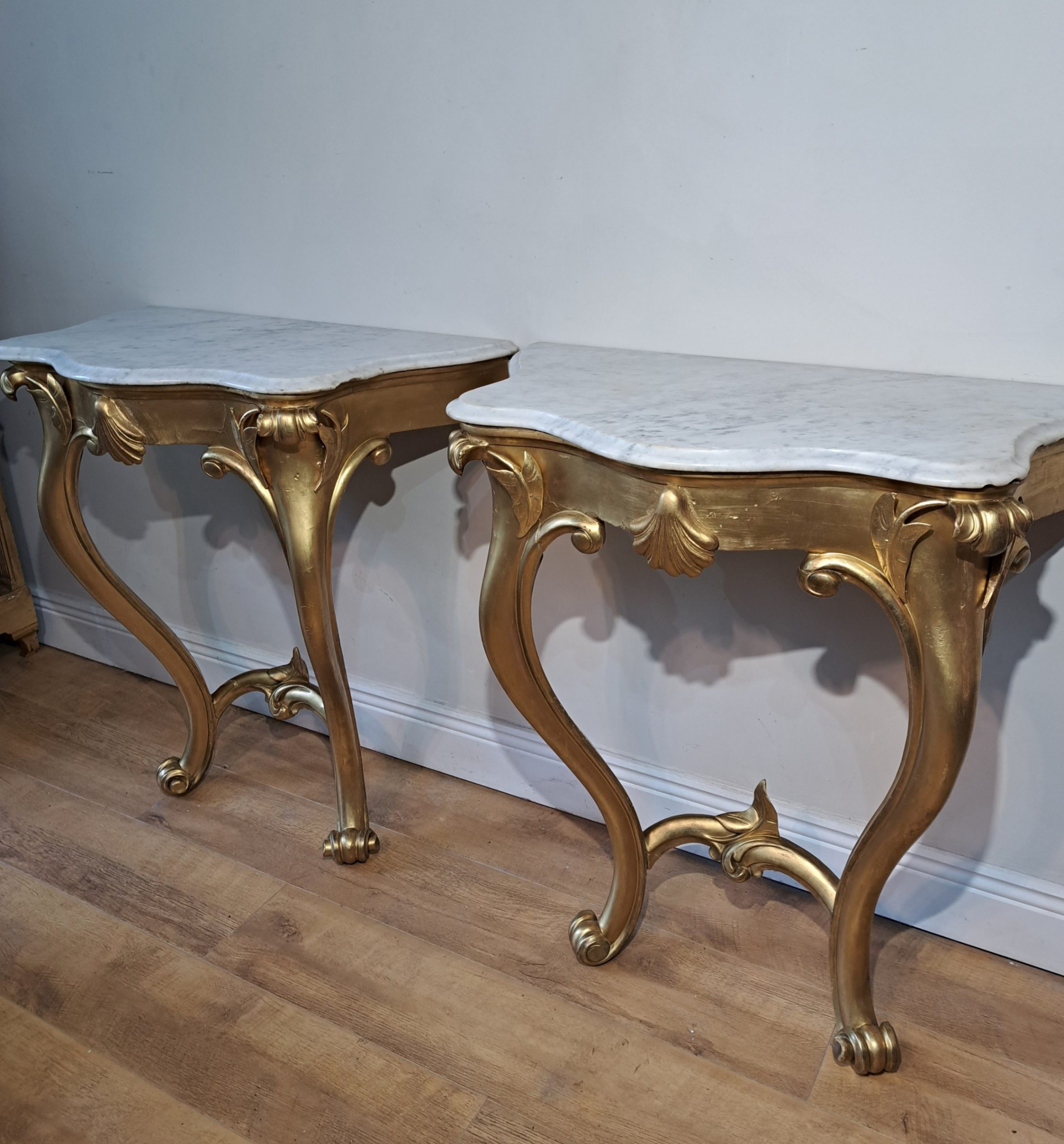 A pair of Irish 19th Century gilt console tables with marble top raised on cabriole legs.