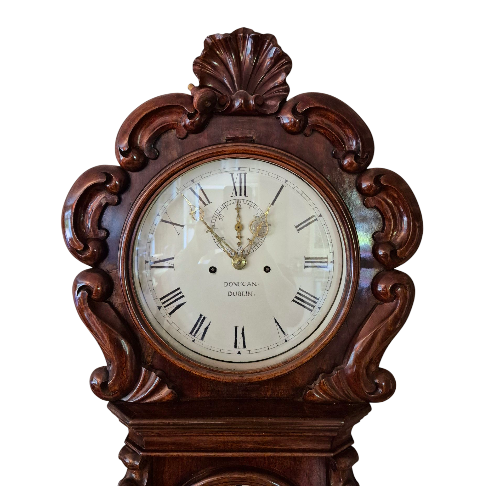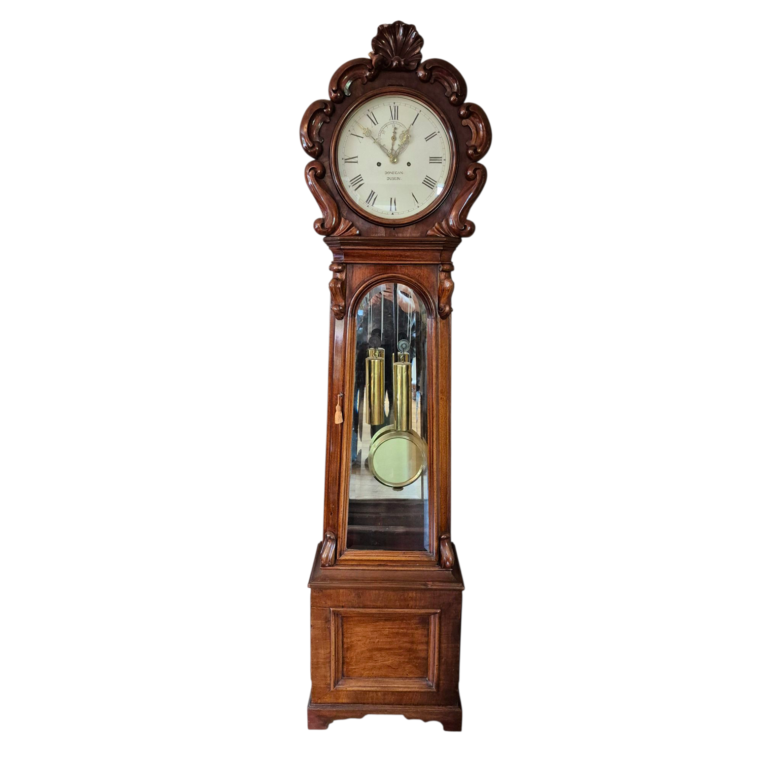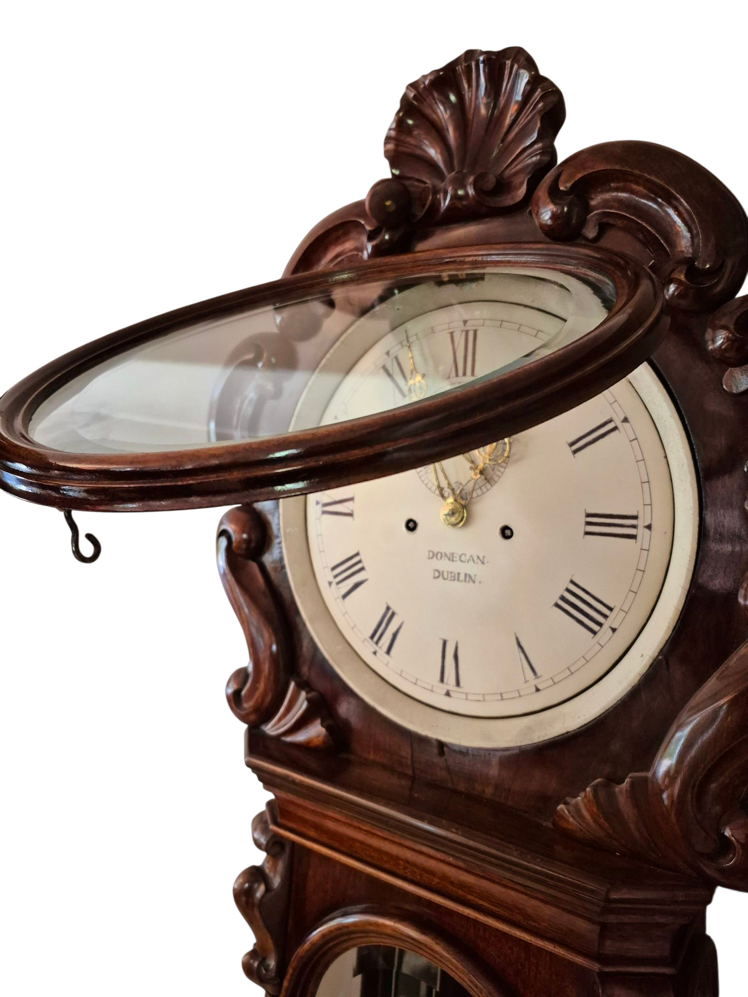 A very rare Irish 19th Century Mahogany Grandfather Clock by Patrick Donegan, Dublin. The clock is the rarest model with three bevelled glazed panels to the front door and the two sides. This is a regulator type mechanism which has been professionally serviced and is keeping perfect time. The clock has its original key.