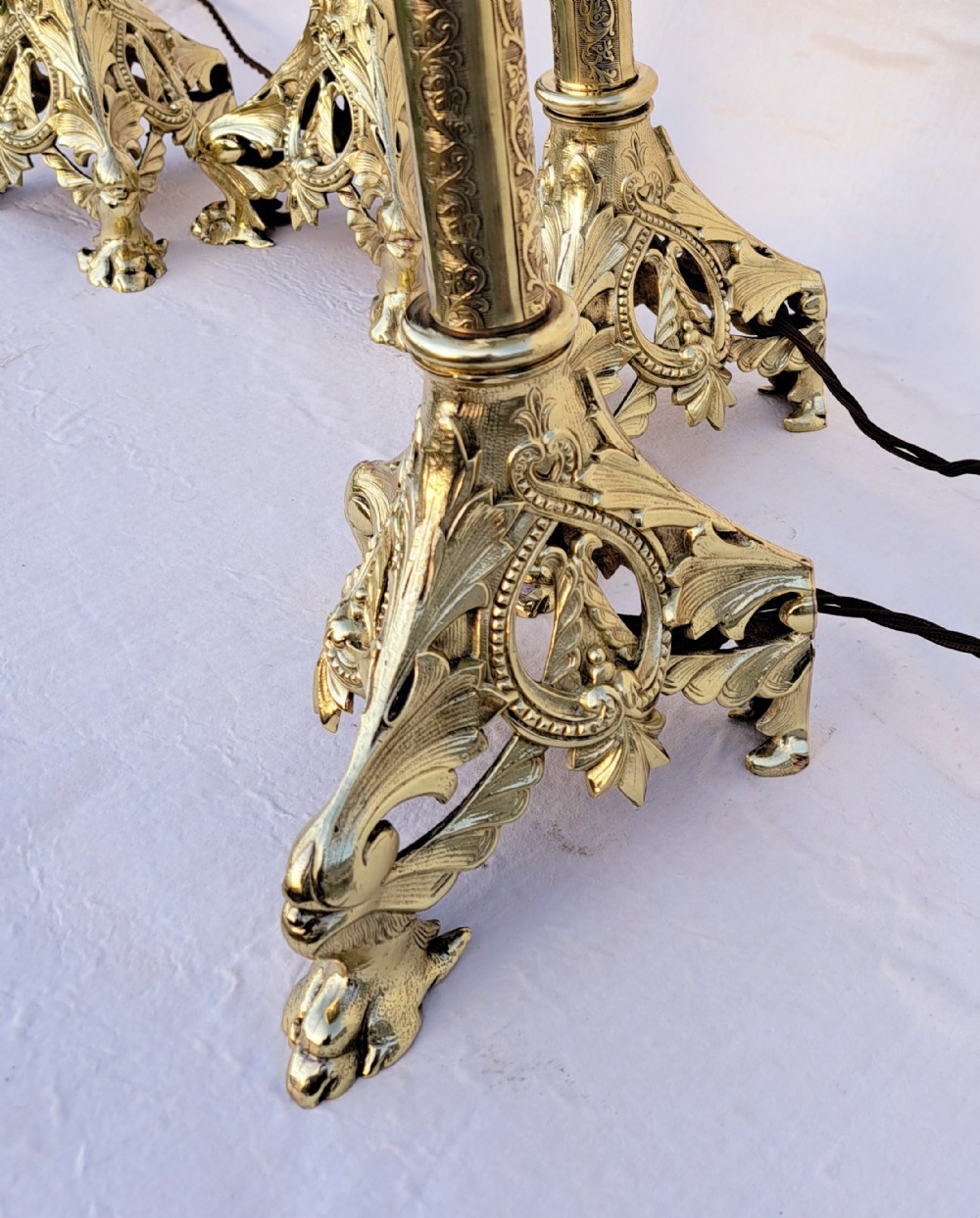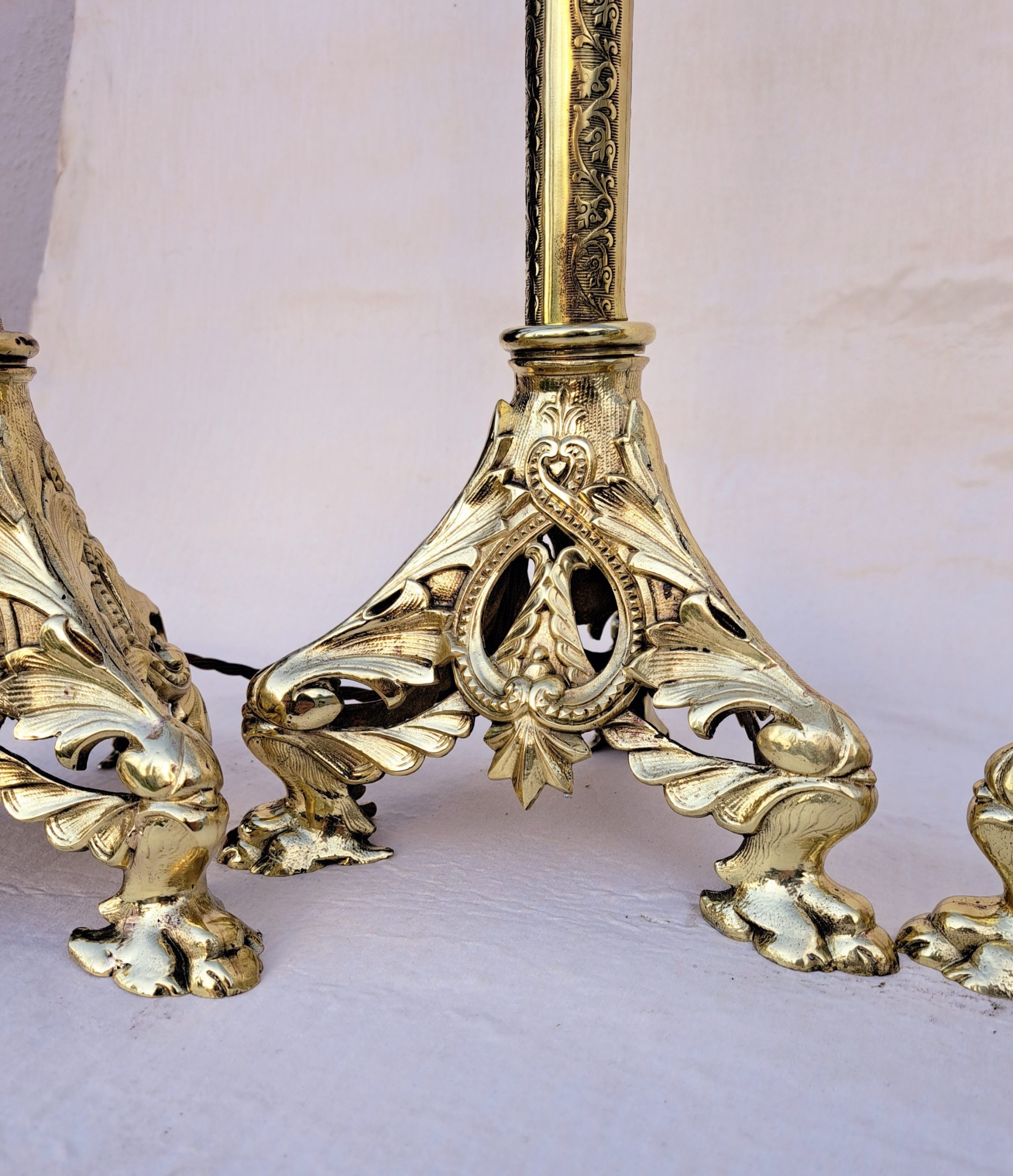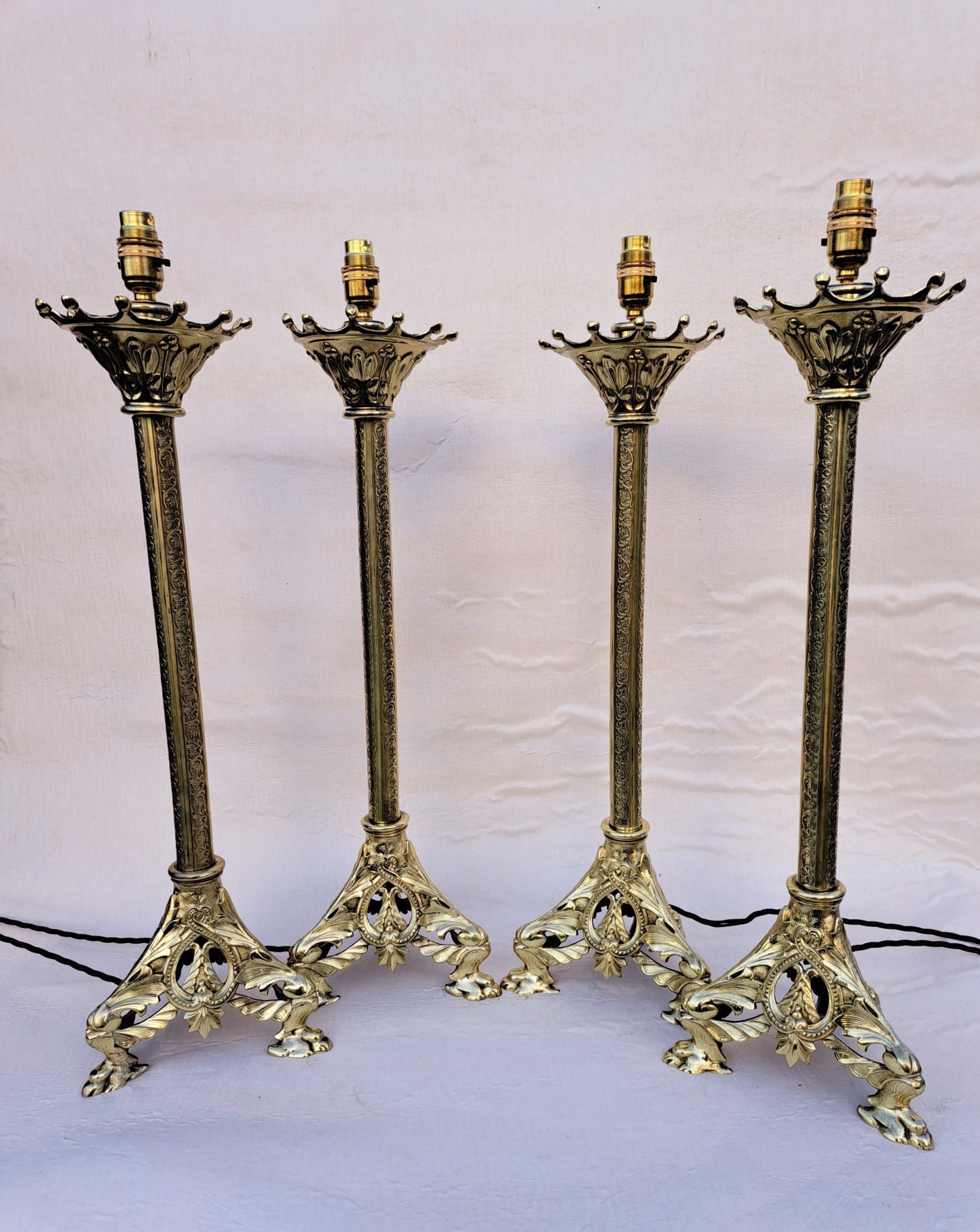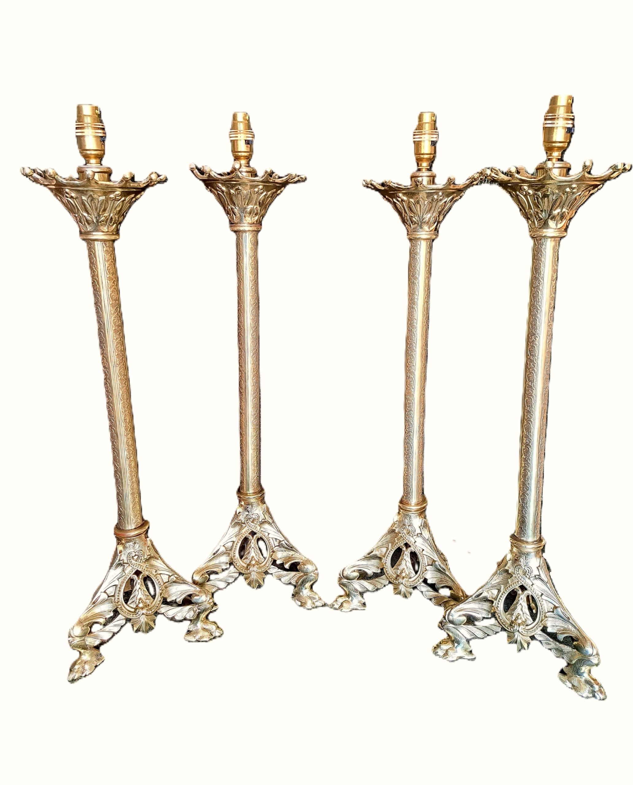 A rare set of four tall 19th Century brass lamps which have been professionally cleaned and sealed.