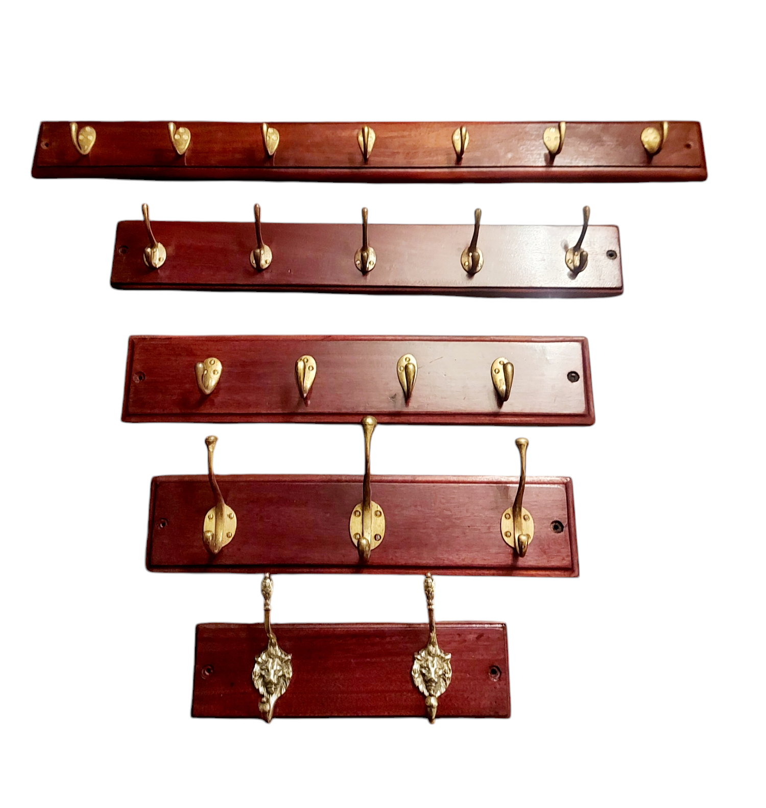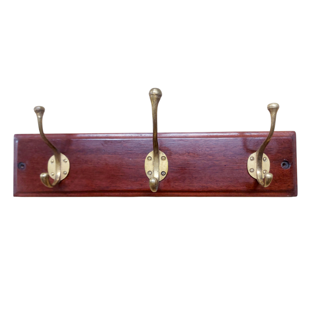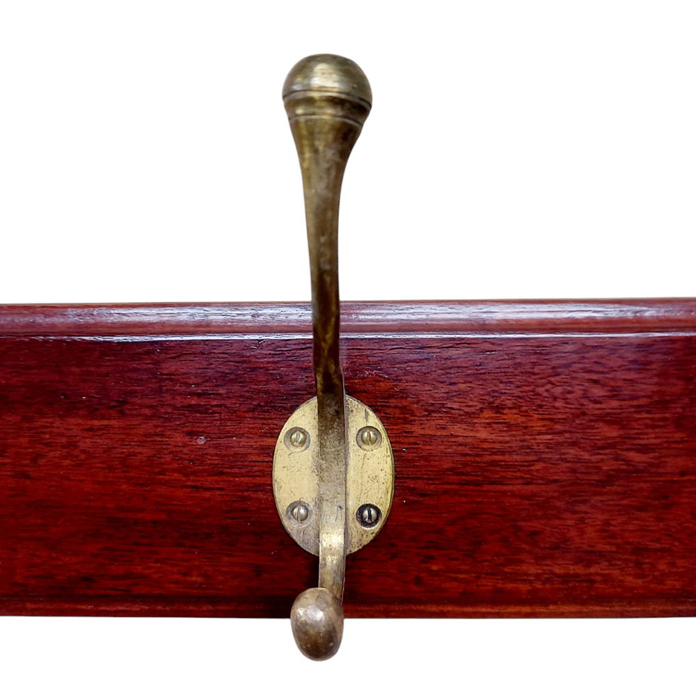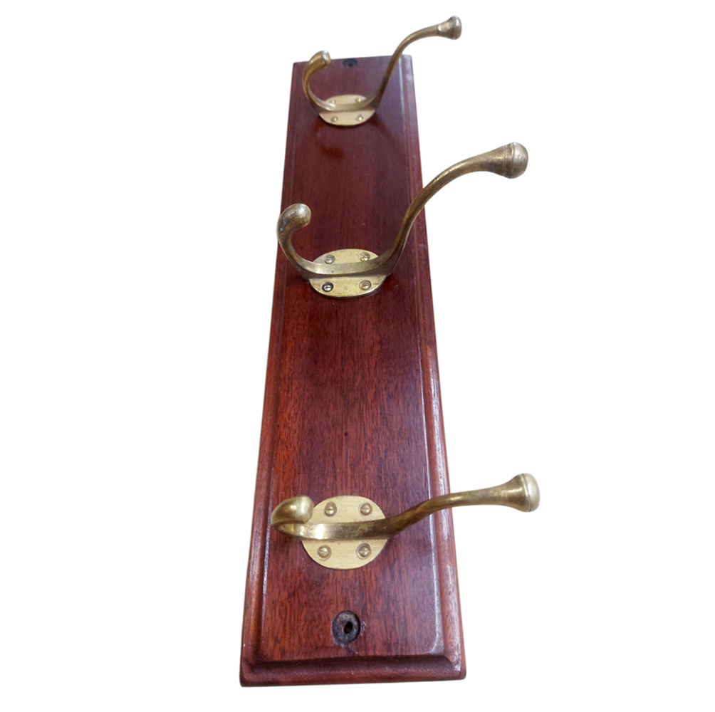 A set of three large Victorian coat hooks mounted on a Mahogany backboard, the centre hook being the largest and the outer two being slightly smaller, but all the same design.