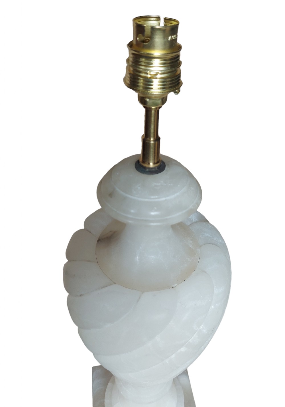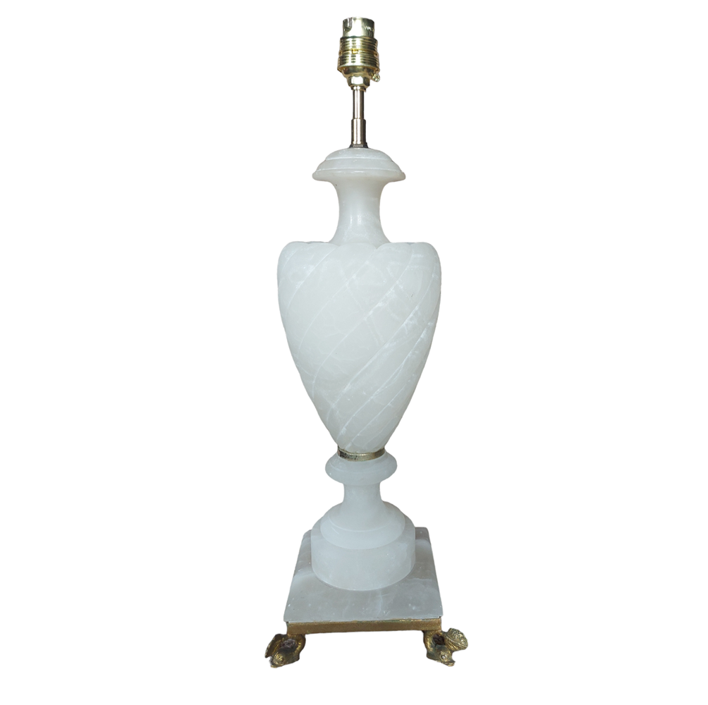 A beautiful white alabaster table lamp with swirling fluted design on the baluster shaped body of the lamp sitting on a gilt base on four feet decorated with leaves and dolphin heads.